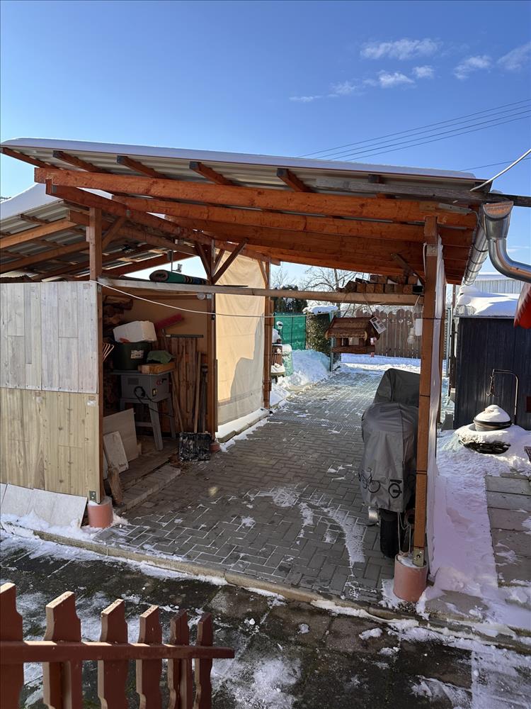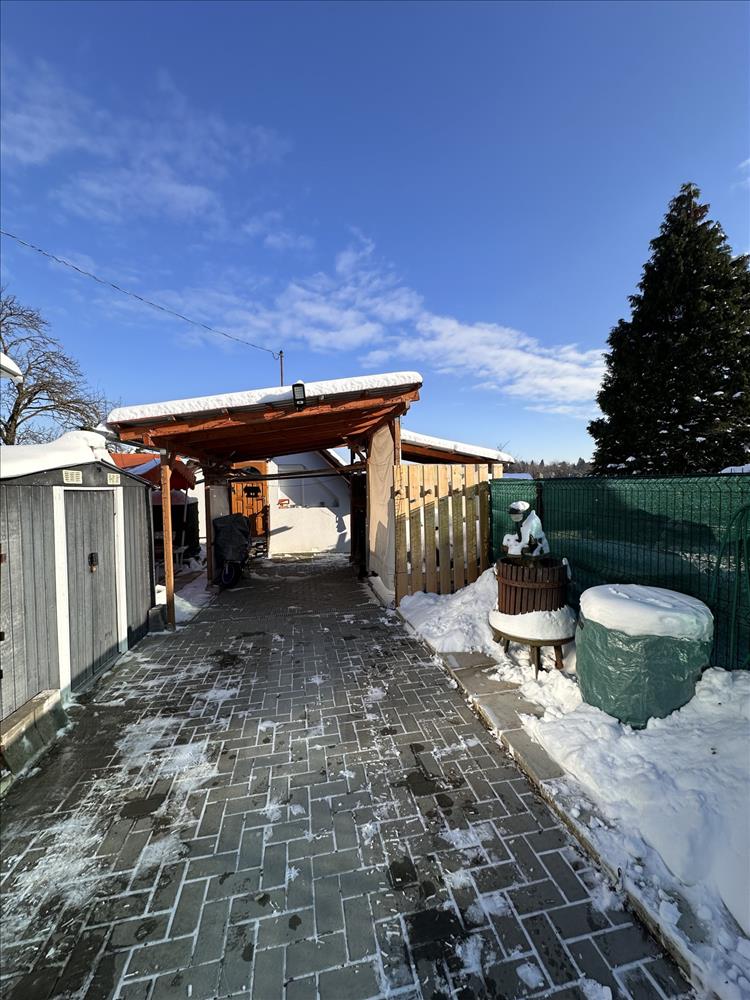 A ház előtt térköves, fedett gépkocsibeálló akár 2 autó részére.