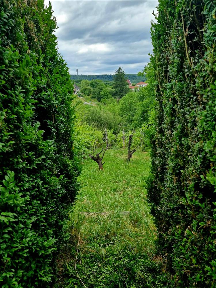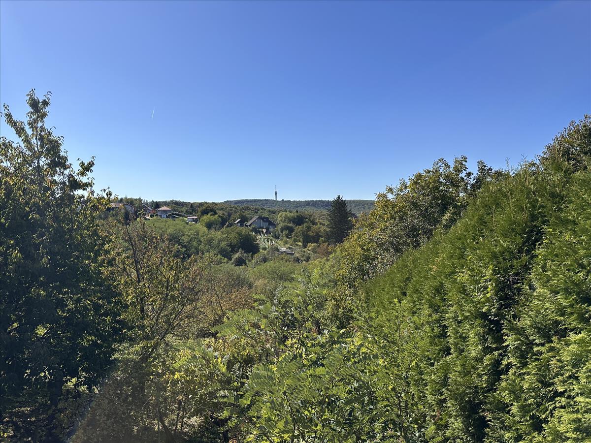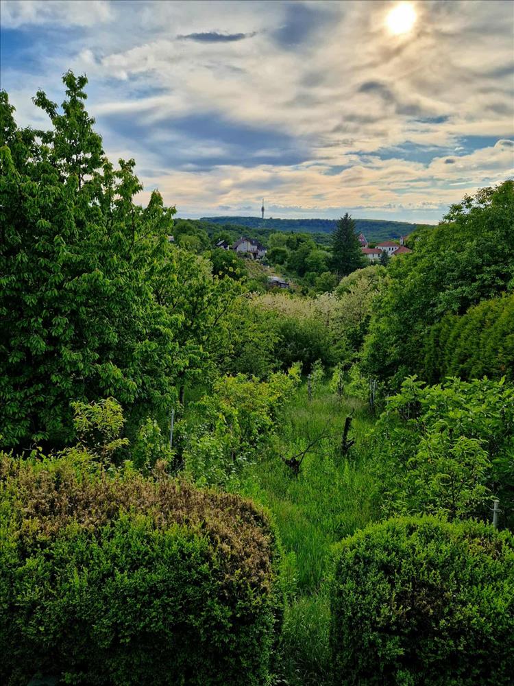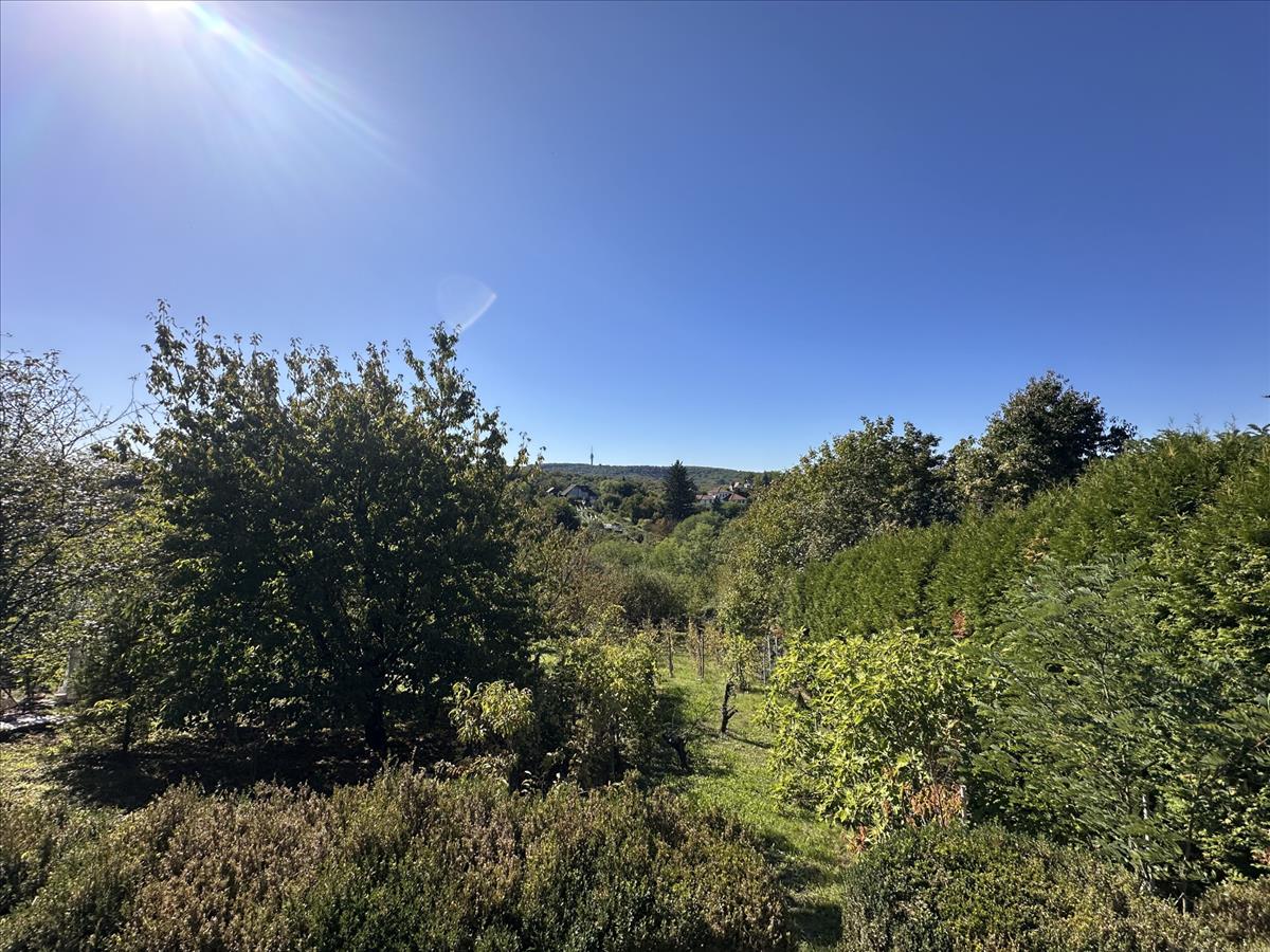 - Tágas, részben sík telek gyümölcsfákkal és kilátással