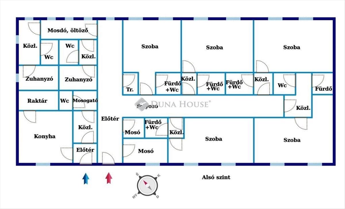 Az épület 2 szintes kialakítású. Alsó szintjén 6 nagyobb méretű szoba (mindegyik szoba saját fürdő+wc-vel rendelkezik), konyha, raktárak, és további zuhanyzók találhatóak. a szinten a helyiségek funkciójának optimalizálásával további 2 kiadható szoba kialakítható. Felső szintjén egy 3 szobás apartman, továbbá egy nagy méretű étkező, és hozzá tartozó konyha találhatóak, mely közösségi térként, de akár büféként, étteremként is hasznosítható. Az épülethez egy műhelynek, tárolónak is alkalmas garázs csatlakozik (mérete nincs benne a megadott 320m2-ben).