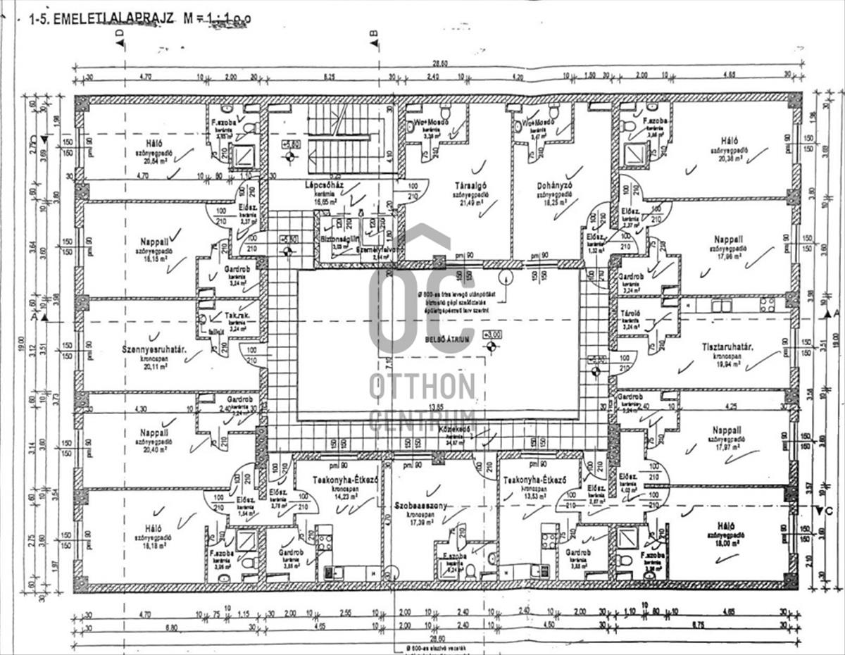 1–5. emelet (szintenként): 398, 44 m²