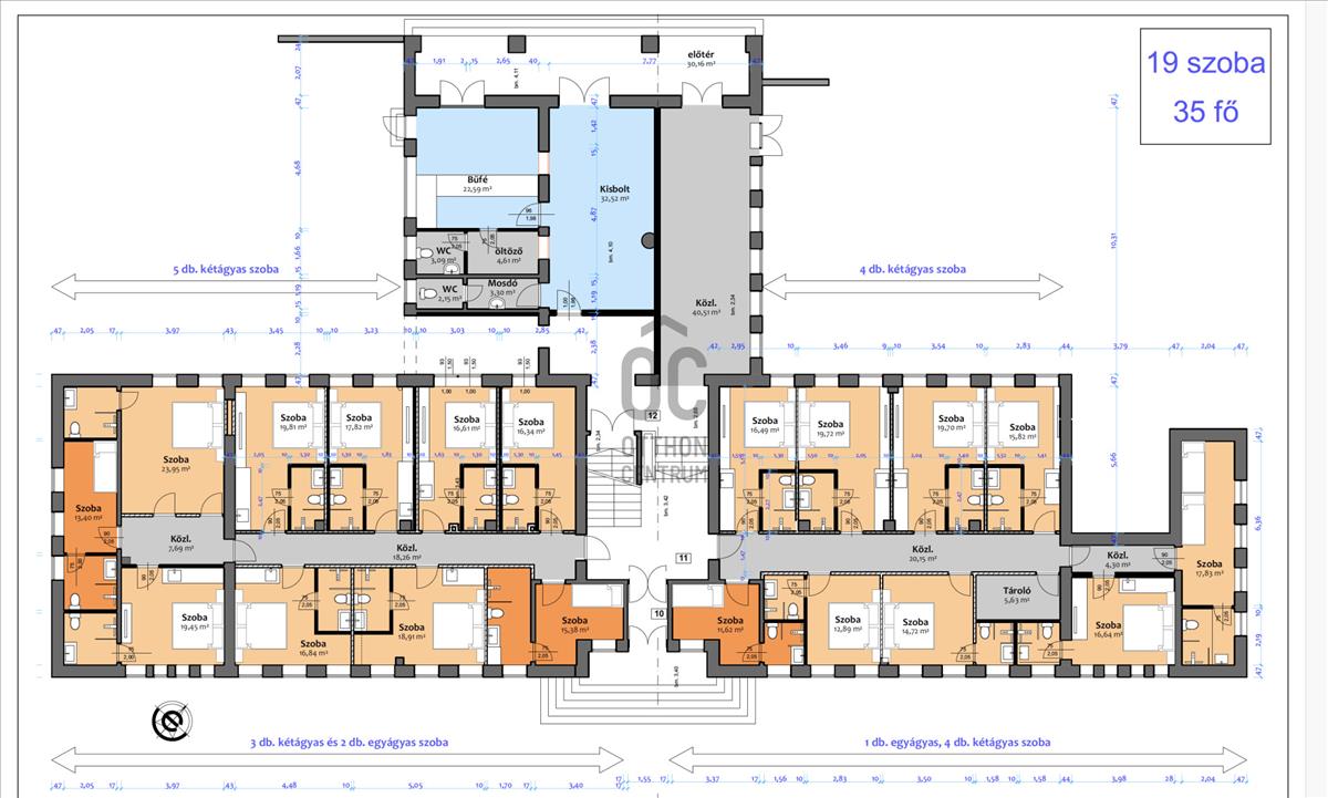 Az ingatlan összes hasznos alapterülete 1500 nm, amiben található 59 db szoba saját fürdővel, raktárak, konyha, recepciós pult és büfé, fedett dohányzó - pihenő, mosókonyha és egyéb kisegítő helyiségek. Jelenlegi kapacitás kb. 130-150 Fő, 1-2-4 fős szobákban vegyesen, jellemzően emeletes ágyak felhasználásával.