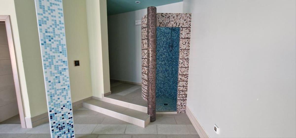 A gyönyörűen parkosított területen egy nagy úszómedence masszázskádakkal és strandokkal, összesen 99 m2.
