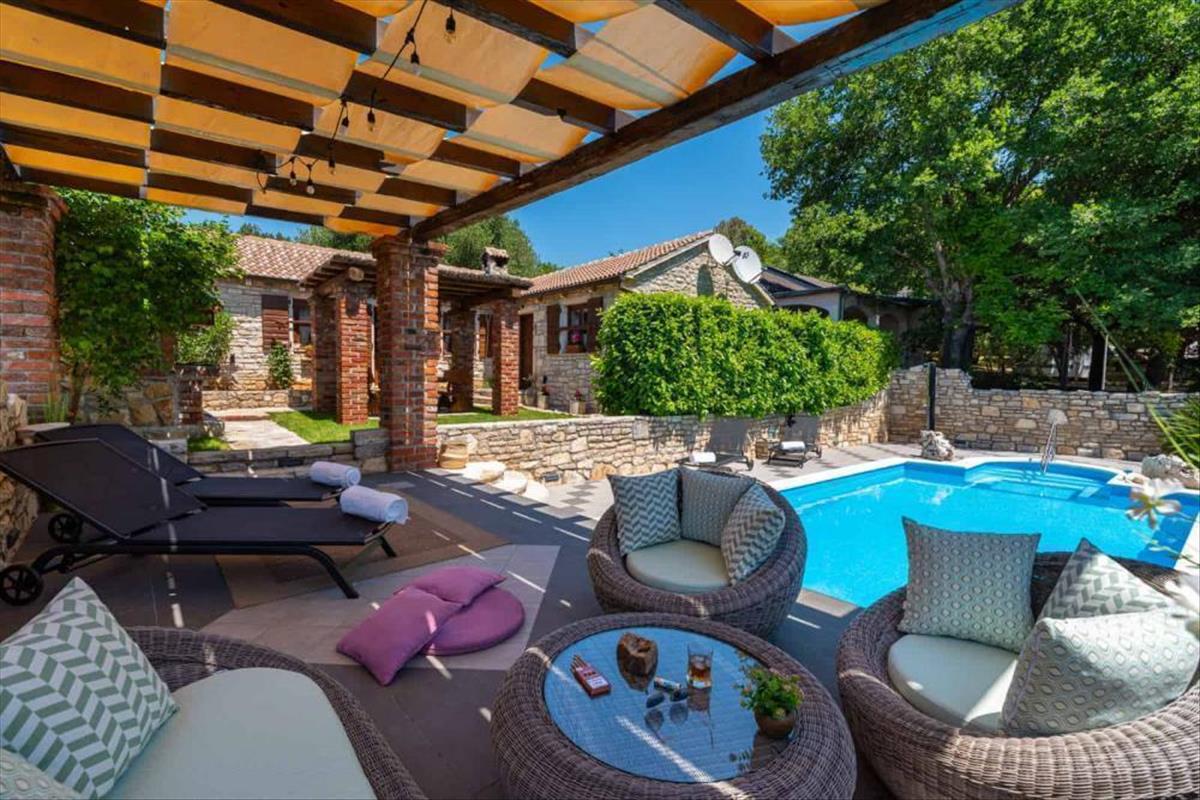 A villa teljesen bekerített udvarán úszómedence, nyári konyha és kerti bútorok pergolákkal a nyári esték eltöltésére szolgálnak.