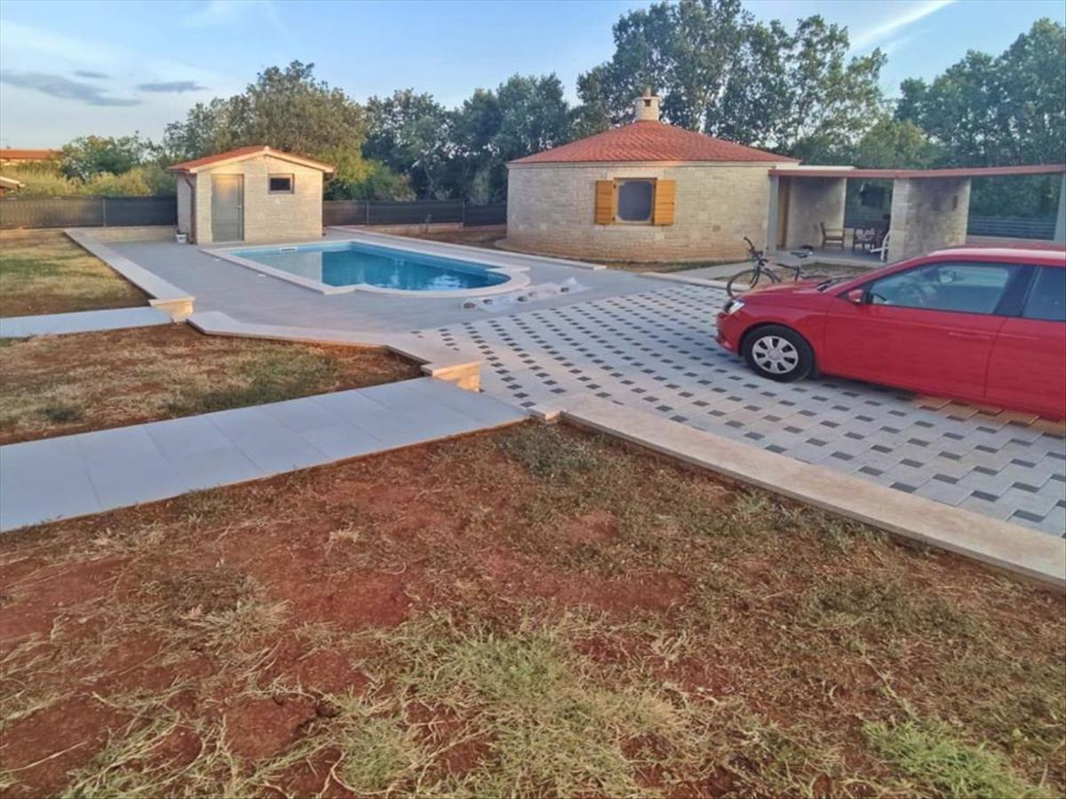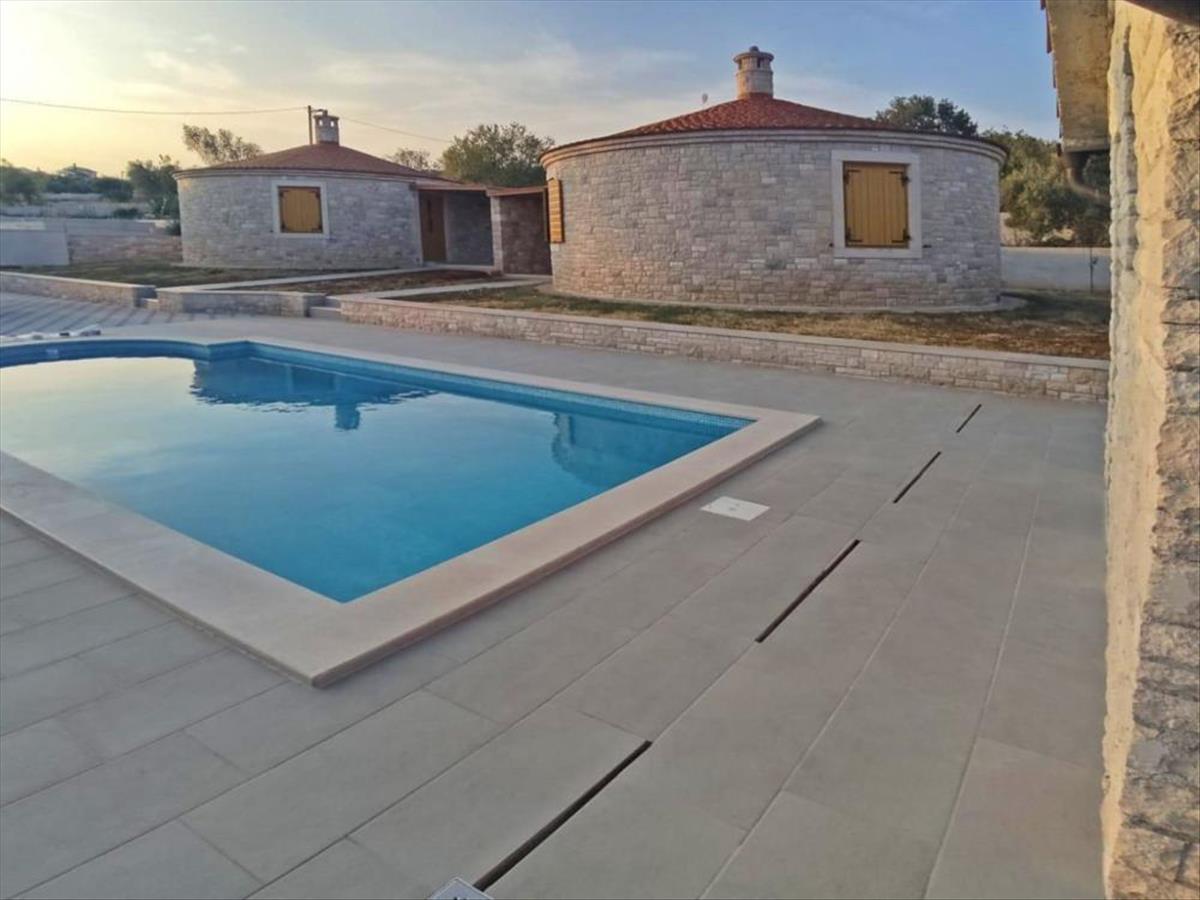 Négy isztriai hagyományos kő kazun egy közös területen úszómedencével.