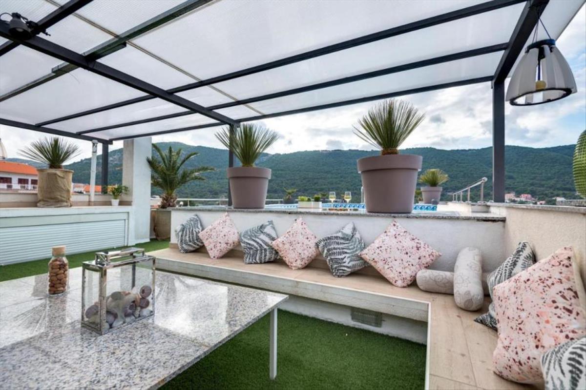 A ház tetején egy csodálatos tetőterasz található 125 m2-es nyugágyakkal és egy 5x3 méteres úszómedencével.