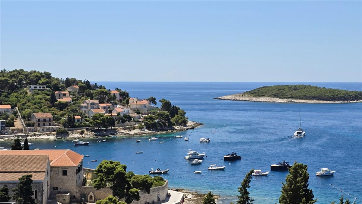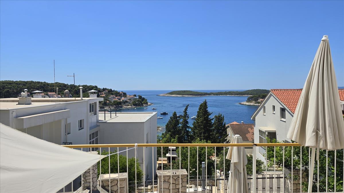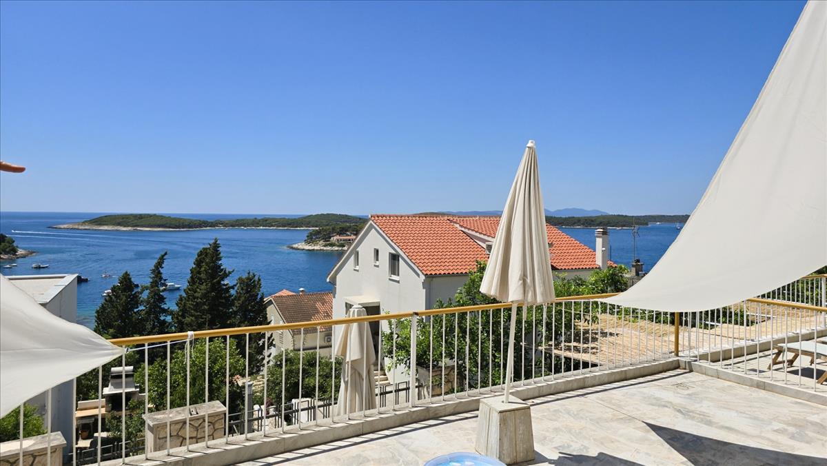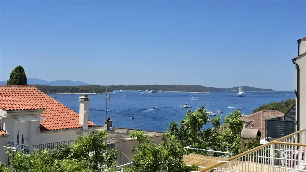 Ez a 176 m²-es ingatlan panorámás kilátást kínál a tengerre, a Pakleni-szigetekre, a Hvar-i kikötőre és a naplementére minden szinten.