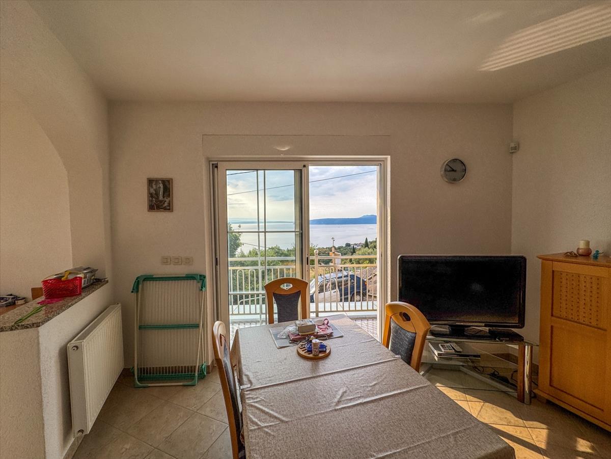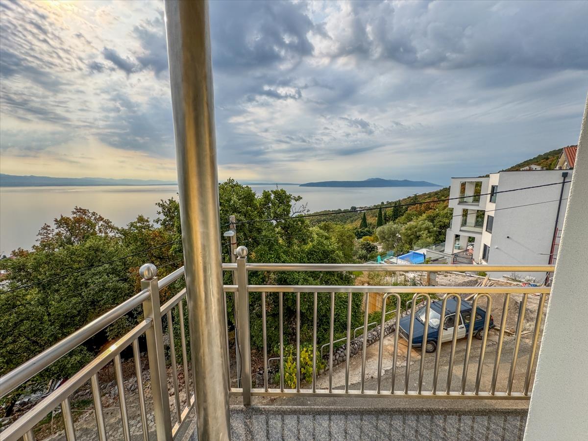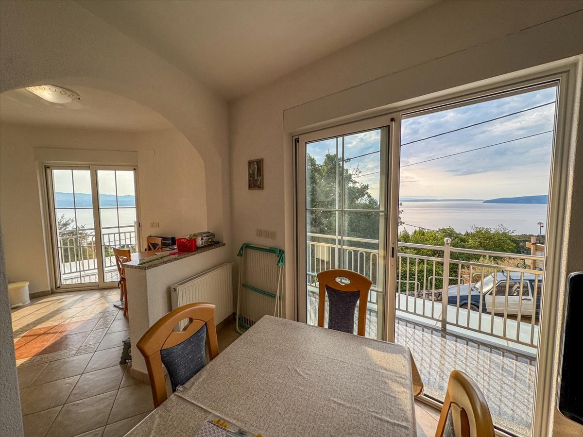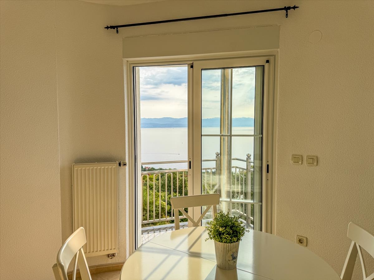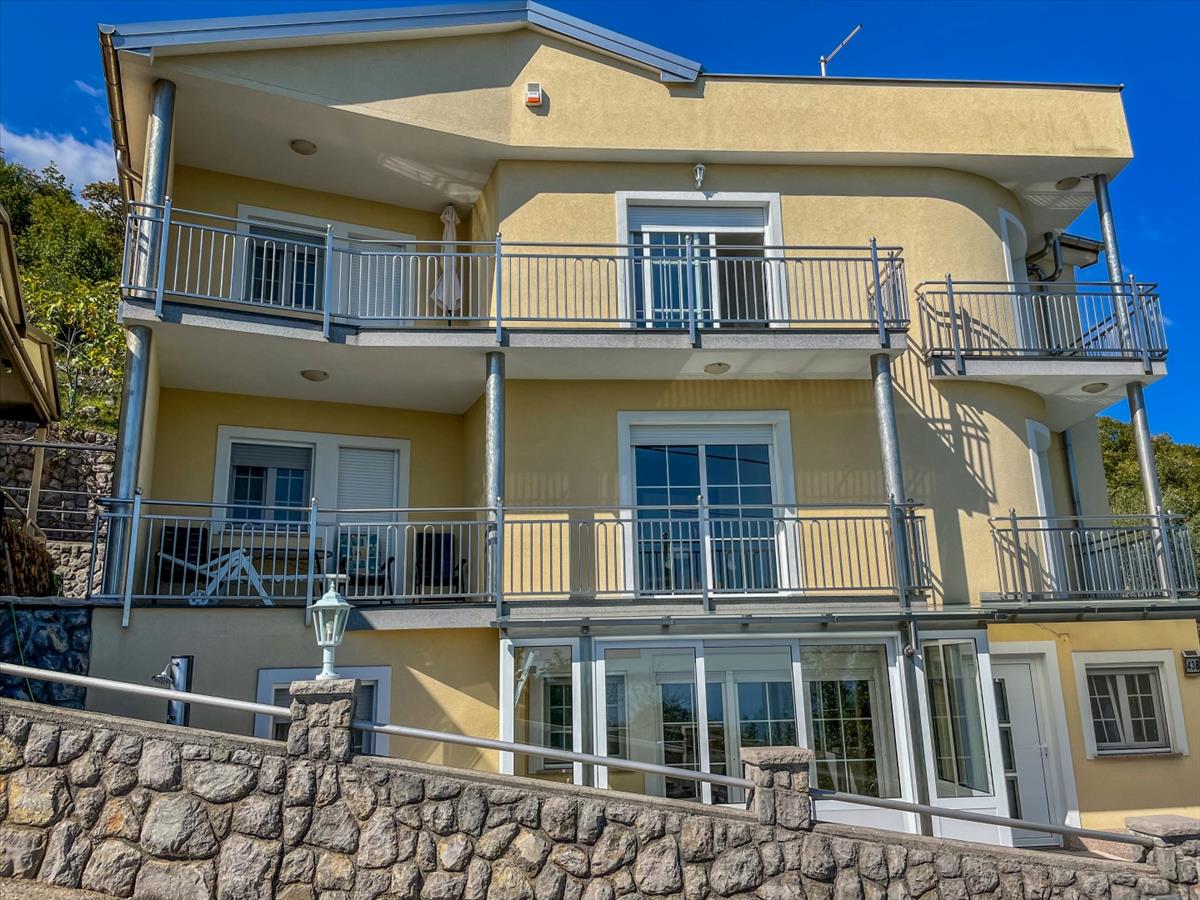 Az ingatlan összesen 7 szobát tartalmaz, 4 hálószobával, 3 fürdőszobával és tágas nappali területekkel, amelyek konyhával rendelkeznek. a padlófűtés és a kandalló fokozza az egyes apartmanok kényelmét és hangulatát. a déli tájolású teraszok és a felső kert megszakítás nélküli kilátást nyújtanak a Kvarner-öbölre, míg a 600 m²-es telek tartalmaz egy kertiházat, grillezőt és bőséges helyet egy medence számára.