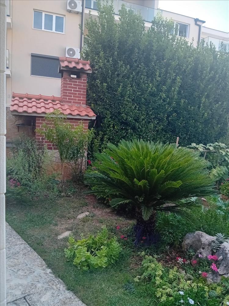 Egy gyönyörűen parkosított kert veszi körül az ingatlant, pálmákkal, citrusfákkal és egy grillezőhellyel, tökéletes a meleg nyári estéken való kikapcsolódásra.