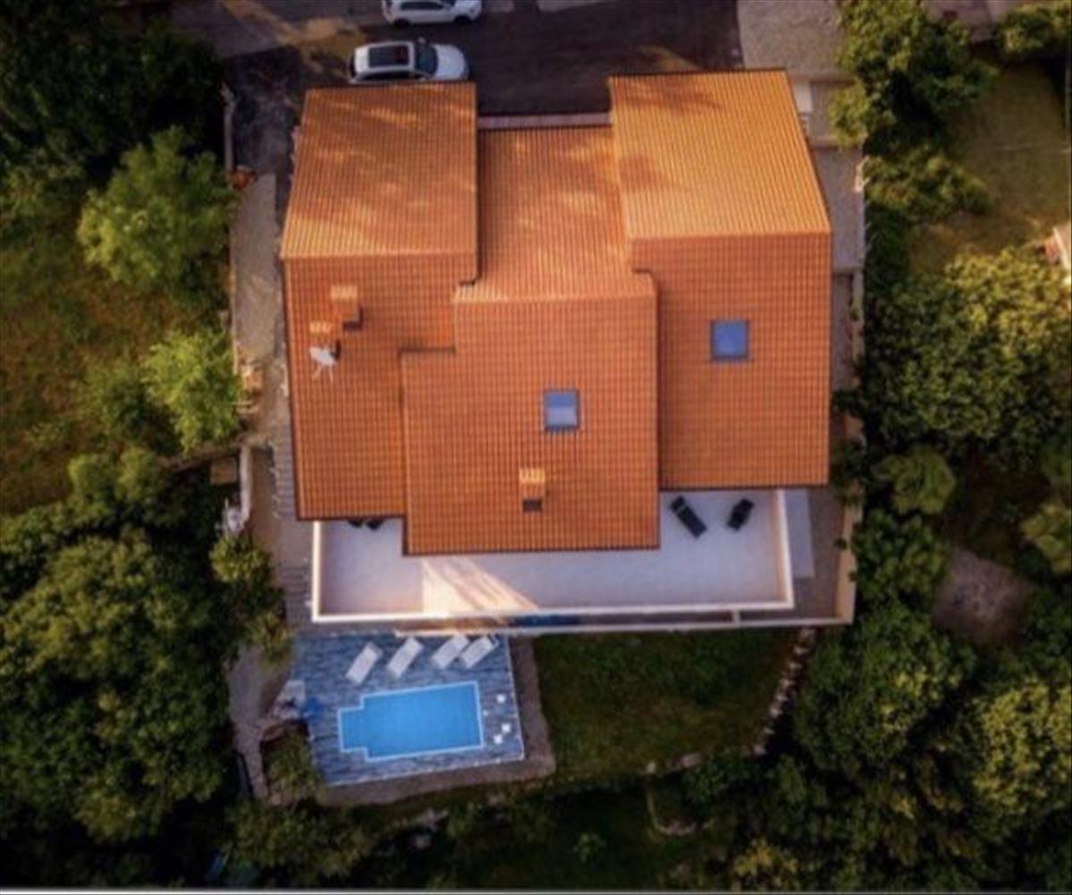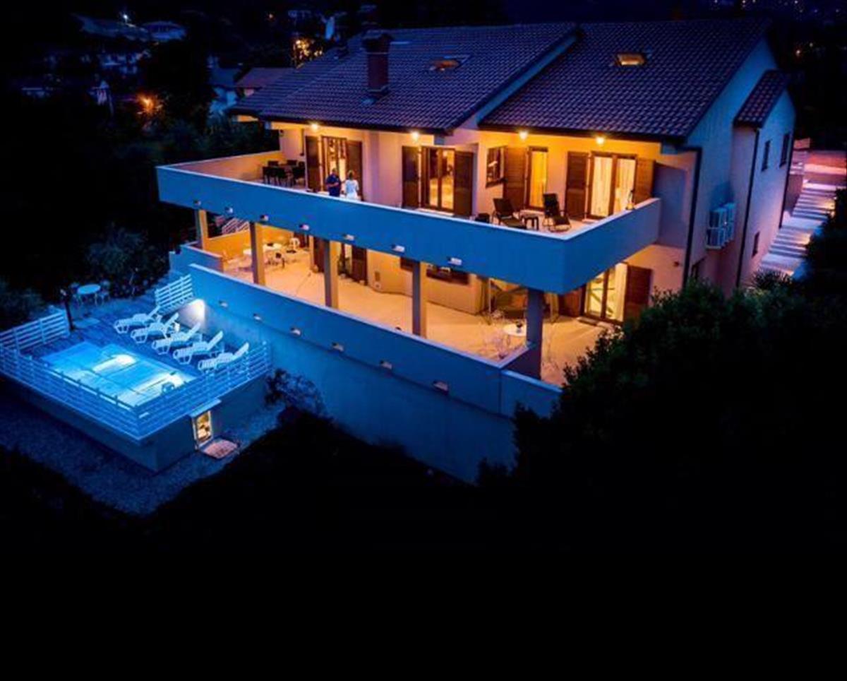 Az ingatlan három szintes, 5 hálószobával, 7 fürdőszobával, 4 nagy nappalival, 4 profi konyhával, 2 120 m2-es terasszal, egyedi kilátással a Kvarnerre, park medencével, garázs két autónak, 8 parkolóhely.