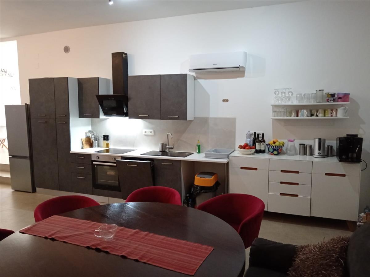 A ház legfelső szintjén további két azonos apartman található, szintén 80 m2-esek, azonos elrendezéssel – nappali, konyha étkezővel, két hálószoba, fürdőszoba, wc és fedett terasz.