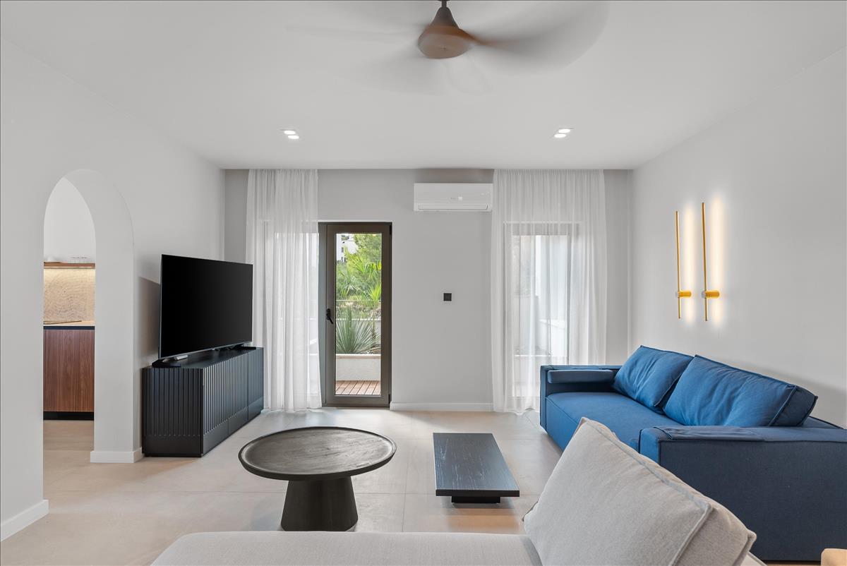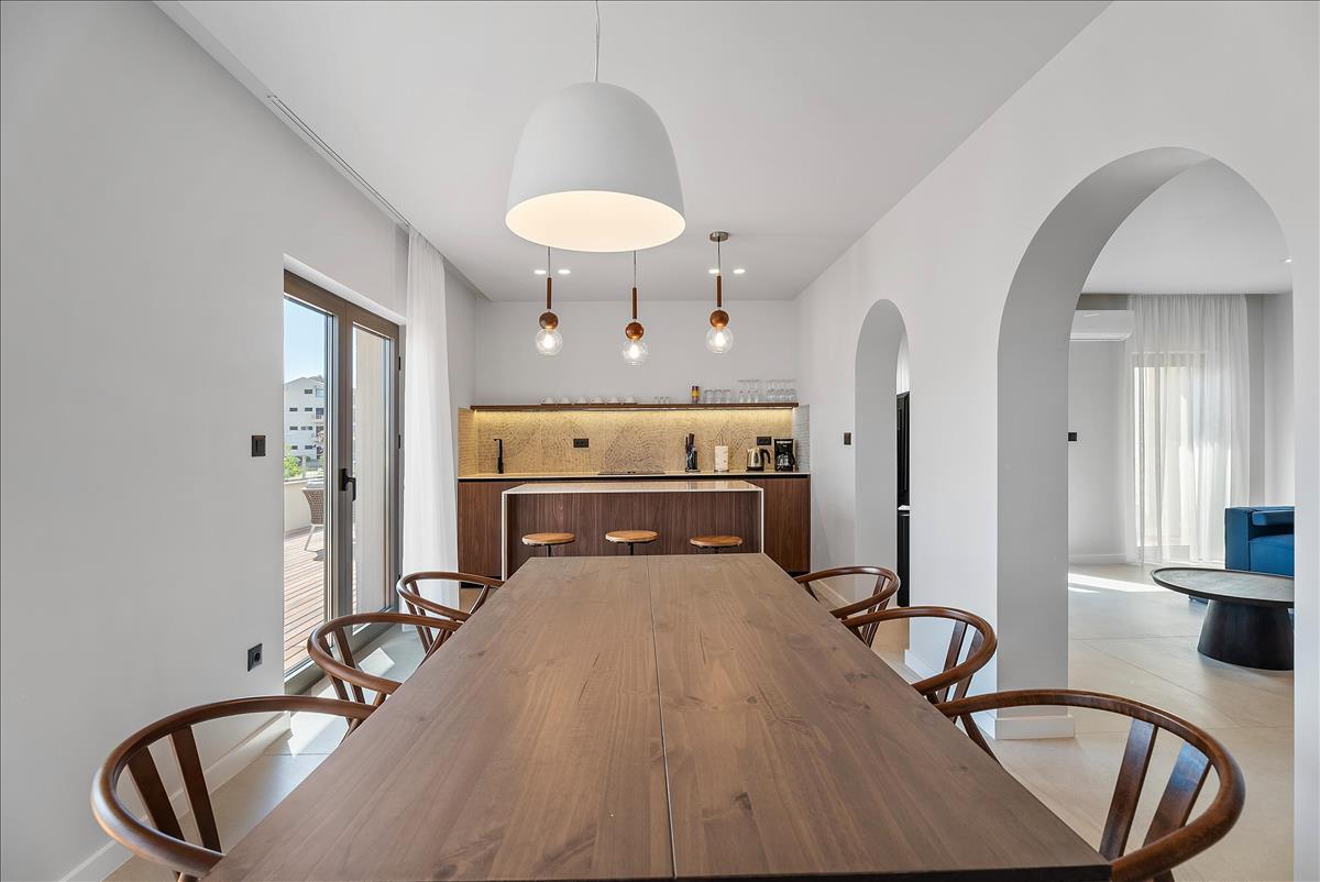Földszint - Apartman a1 (162, 38 m²): Tágas konyha, nappali, étkező, két elegáns hálószoba, egy gardrób, két luxus fürdőszoba és egy nagy terasz.
