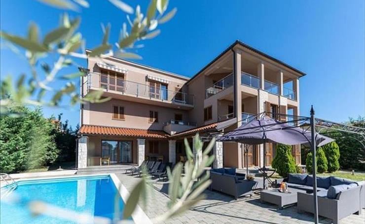A ház nagyon jó minőségű belsővel, komplett klímával, 37 m2-es kültéri úszómedencével, nagy bekerített udvarral, közel a tengerhez.