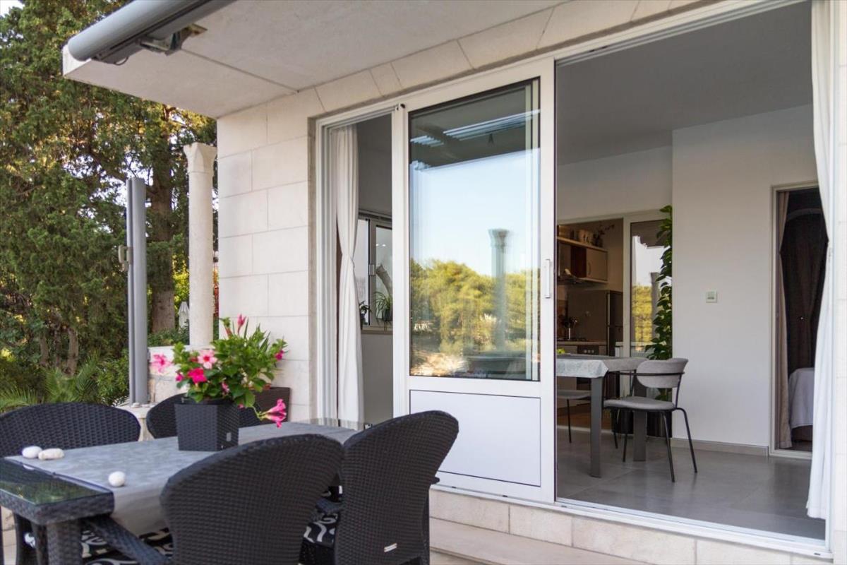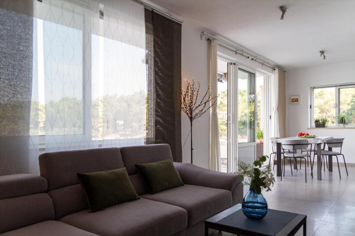 A 4. Számú apartman az épület első emeletén található, tágas teret kínál két hálószobával, nappalival, konyhával és étkezővel, fürdőszobával, egy külön WC-vel, folyosóval és tárolóval. Ez az egység saját bejárattal és egy 29, 58 négyzetméteres tágas nyitott terasszal is rendelkezik, amely ideális a tengeri szellő és a mediterrán környezet élvezésére.