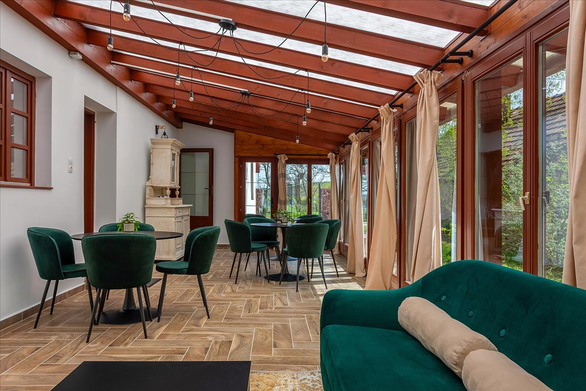 Fedett télikert: világos közösségi tér nagy üvegfelületekkel – ideális reggeliztetéshez vagy vendégrendezvényekhez
