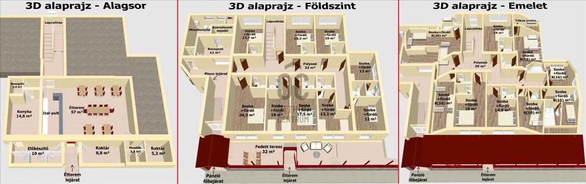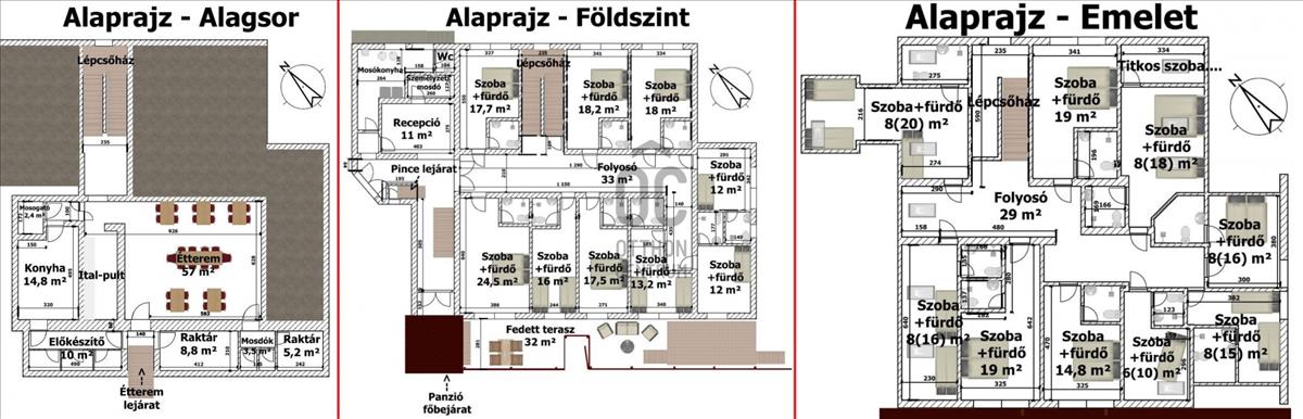 - Emelet: 9db apartmanszoba fürdőszobával.