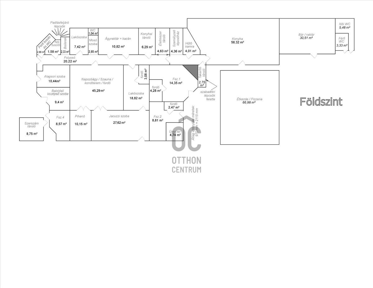 - Különálló 58 m2-es teljesen felszerelt, gépesített konyhával rendelkezik az ingatlan, valamint 67 m2-es különálló fedett vendégtérrel, pizzasütő kemencével, és 30 m2-es különálló söröző