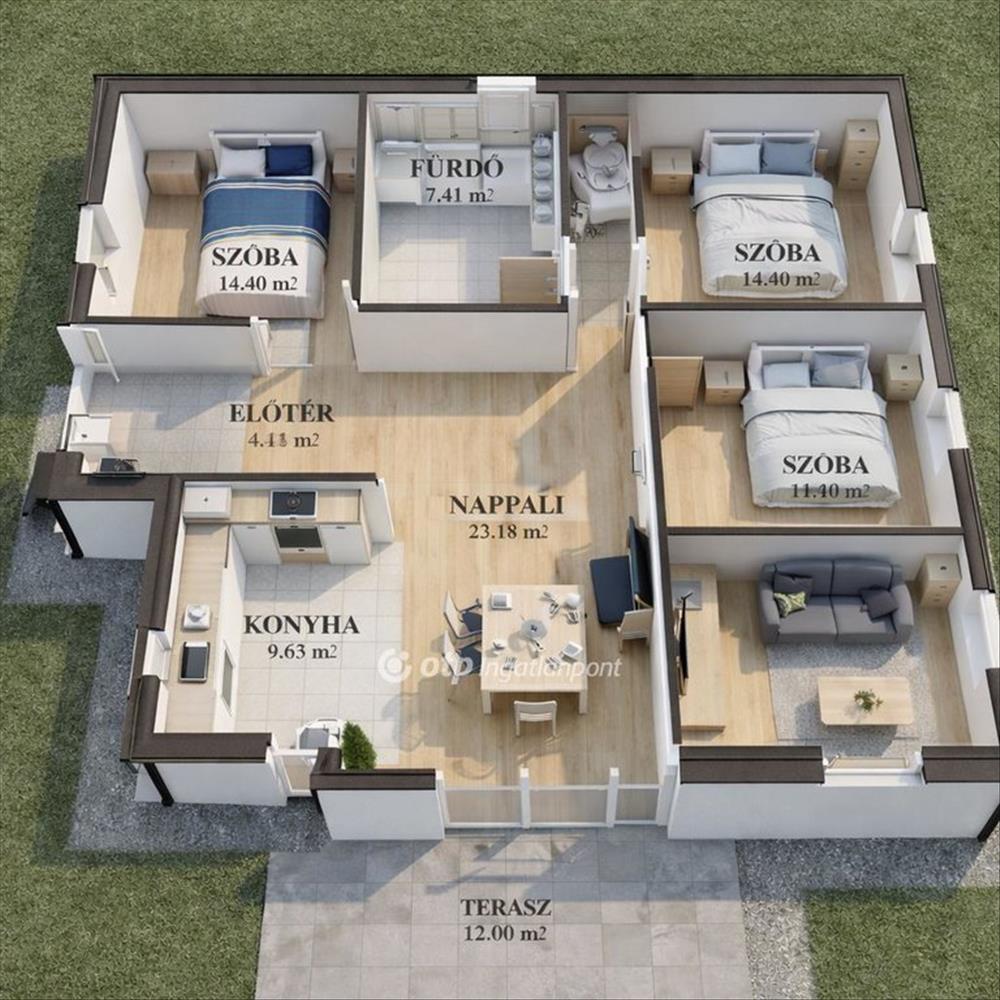 A belső elrendezés egy amerikai konyhás nappaliból áll, amely közvetlen teraszkapcsolattal rendelkezik, továbbá négy külön nyíló hálószoba, egy tágas fürdőszoba, egy külön wc, valamint mosókonyha és további praktikus kiszolgáló helyiségek kerültek kialakításra.