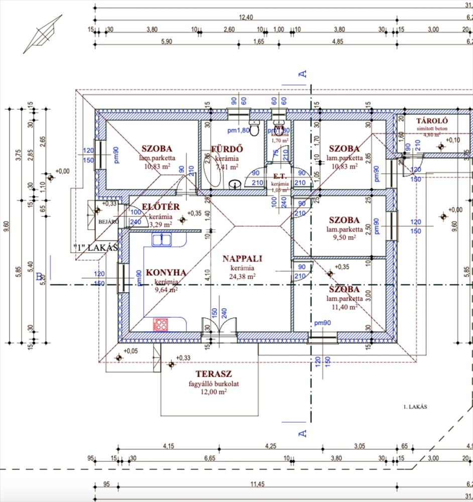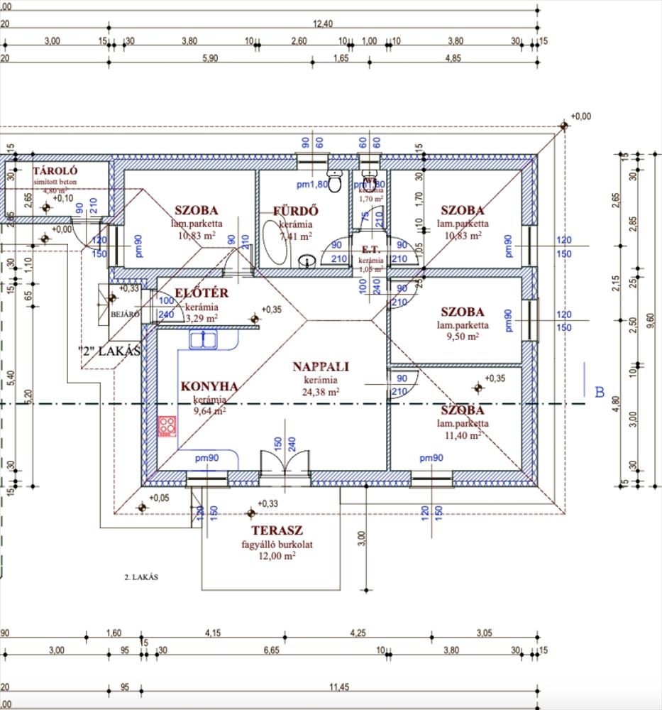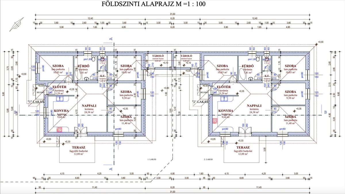 MÉRETEK, tájolás, elrendezés, az ALAPRAJZOKON.