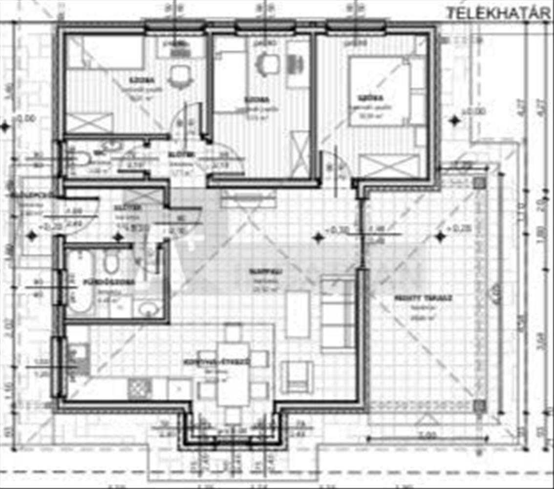 nappali + amerikai konyha, 3 külön bejáratú hálószoba, fürdőszoba, 2 wc