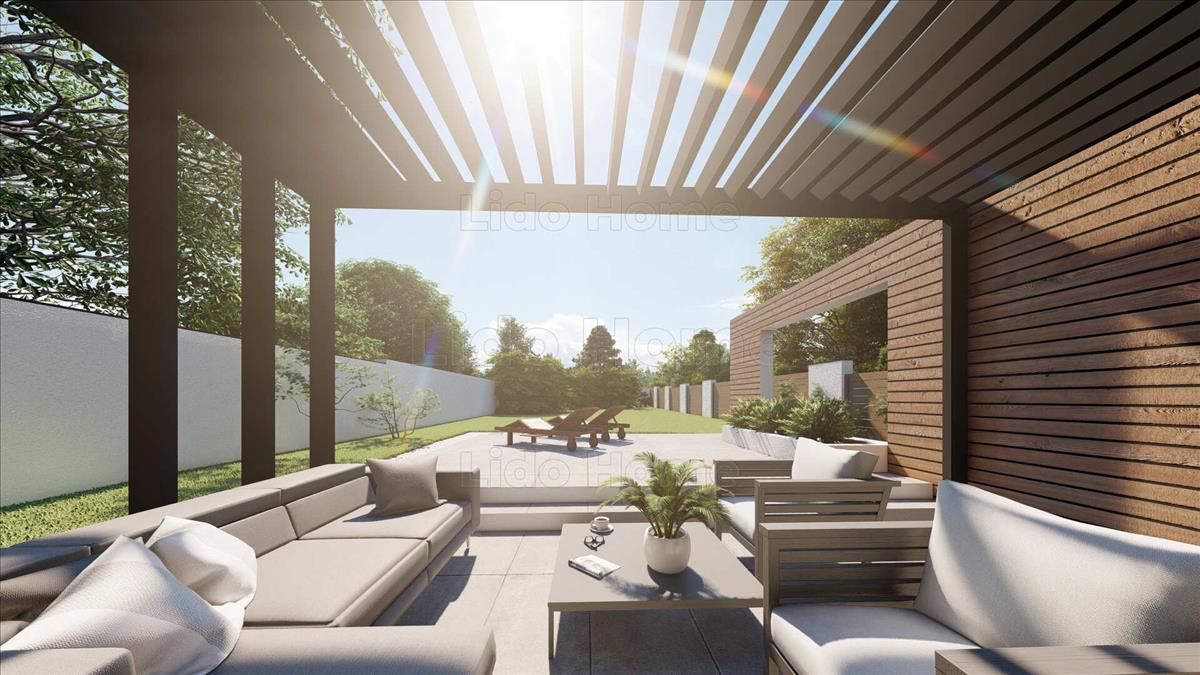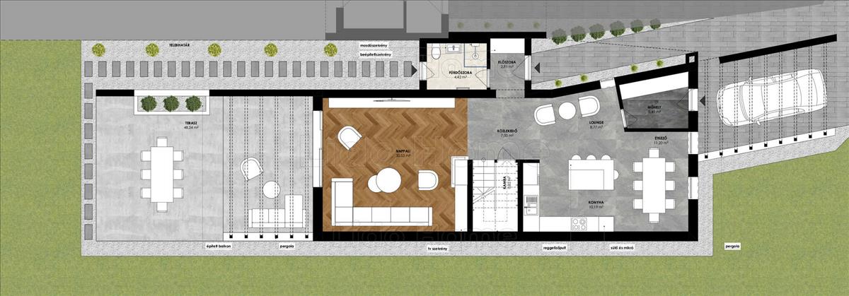 -A földszinten egy világos, tágas amerikai konyhás nappali került kialakításra, amely közvetlenül kapcsolódik a részben pergolával fedett, nagy méretű teraszhoz. Egy ízlésesen kialakított fürdőszoba, valamint egy jól elhelyezett tároló/műhely kapott még helyet a földszinten.