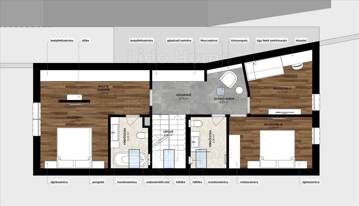 -Az emeleten három stílusos, világos hálószoba, egy tágas gardrób és két fürdőszoba került kialakításra: az egyik elegáns káddal, míg a másik modern zuhanyzóval felszerelt – biztosítva a maximális kényelmet és választási lehetőséget.