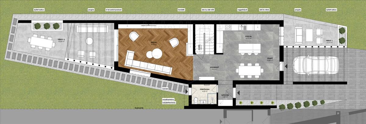 -A földszinten egy világos, tágas amerikai konyhás nappali került kialakításra, amely közvetlenül kapcsolódik a részben pergolával fedett, nagy méretű teraszhoz. Egy ízlésesen kialakított fürdőszoba kapott még helyet a földszinten.