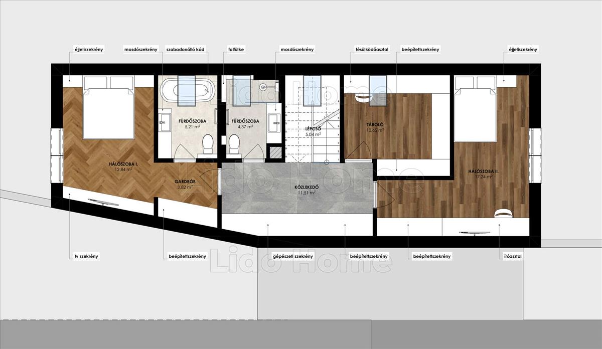 -Az emeleten kettő stílusos, világos hálószoba, egy tágas gardrób, egy tároló és két fürdőszoba került kialakításra: az egyik elegáns káddal, míg a másik modern zuhanyzóval felszerelt – biztosítva a maximális kényelmet és választási lehetőséget.