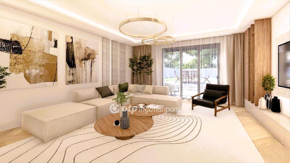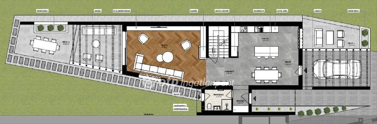 Földszint: Tágas, amerikai konyhás nappali, amely közvetlen kapcsolattal rendelkezik egy pergolás hatalmas terasszal. Ideális helyszín a családi összejövetelekhez és a baráti vacsorákhoz. Ezen kívül fürdőszoba is megtalálható a mindennapi élet megkönnyítésére.