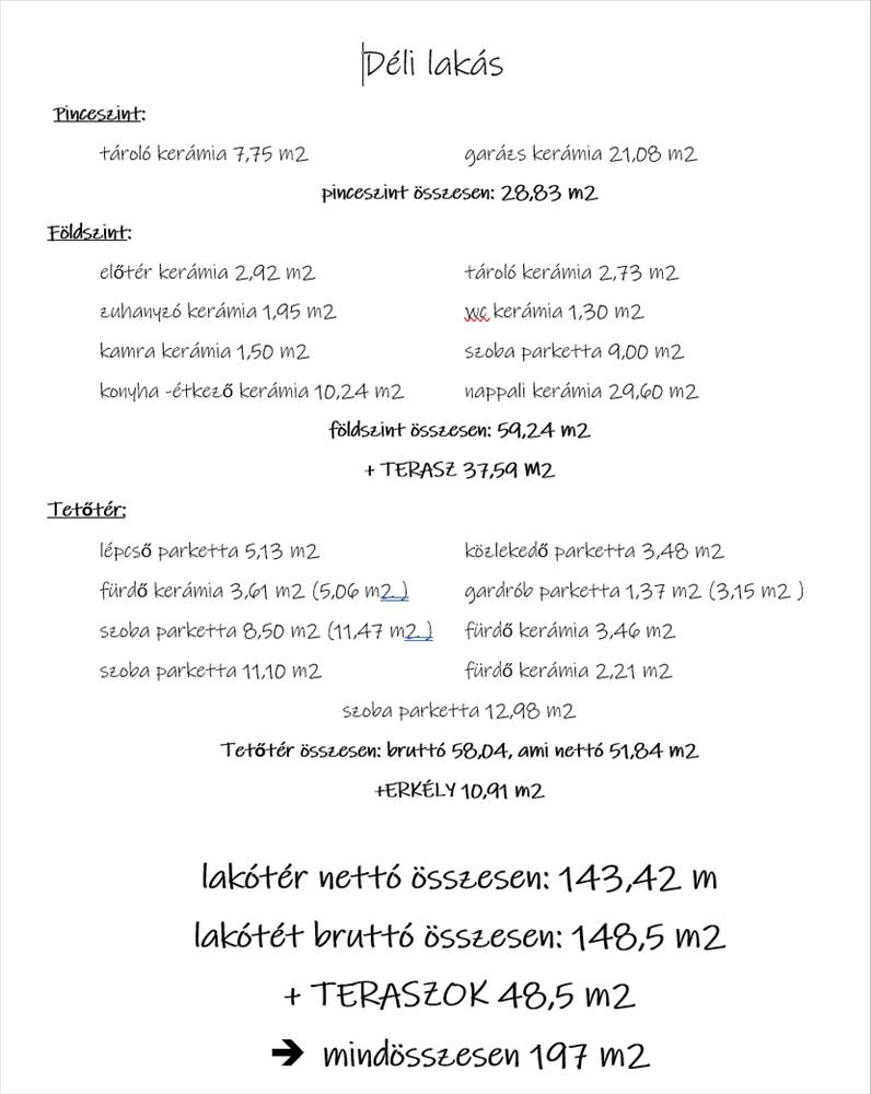 o Földszint (62, 75 m2 + 37, 59 m2 terasz)+ emelet (58, 04 m2+ 10, 91 m2 erkély) +a szuterénben 21, 89, m2 garázs és 5, 31 m2 tároló/kerékpártároló, így összesen bruttó 197 m2