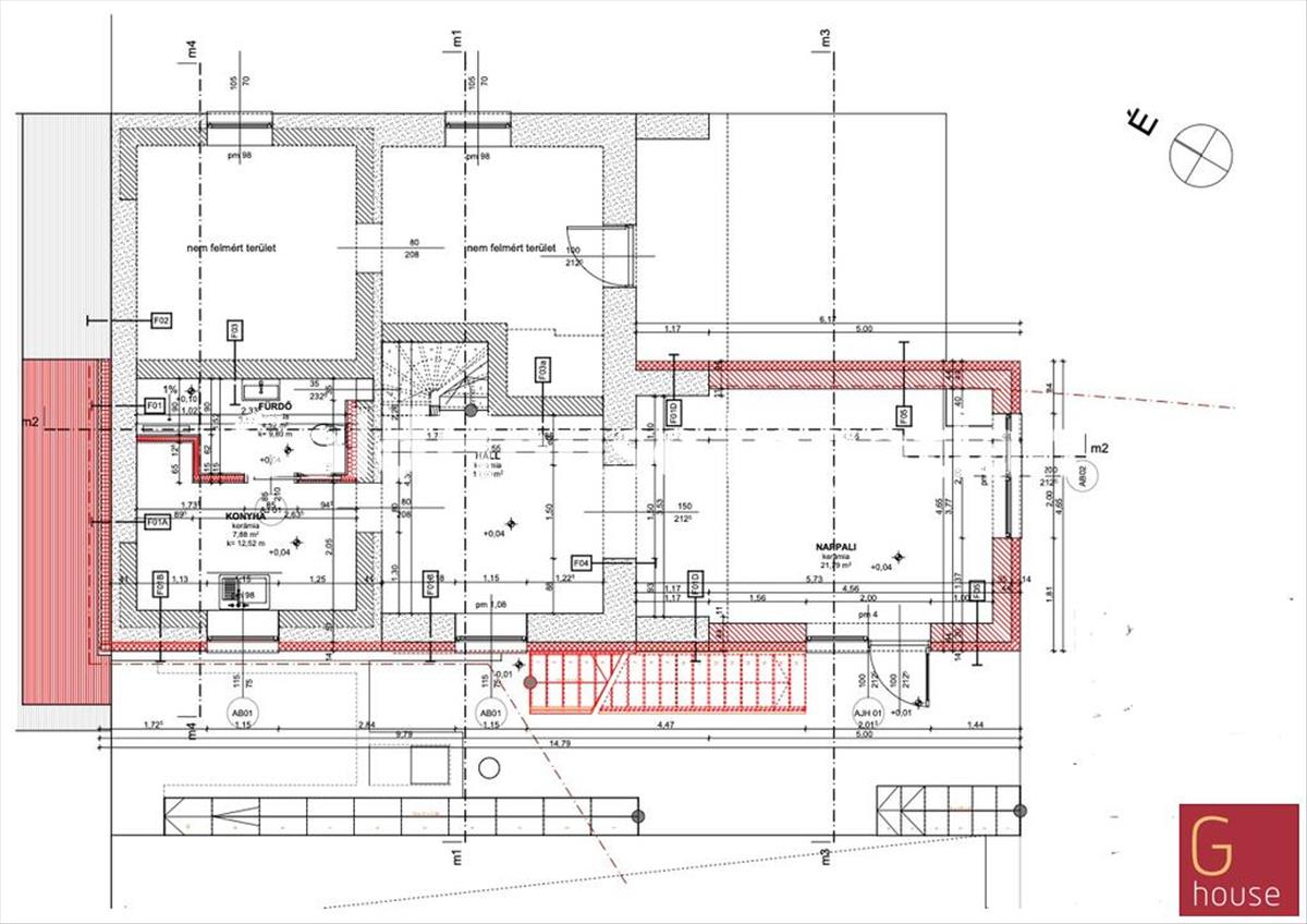 Földszint: Konyha – 7, 88 m², Fürdőszoba – 4, 52 m², Hall (lépcsőfeljáróval) – 13, 60 m², Nappali (duplaszárnyas panorámaajtóval) – 21, 79 m²