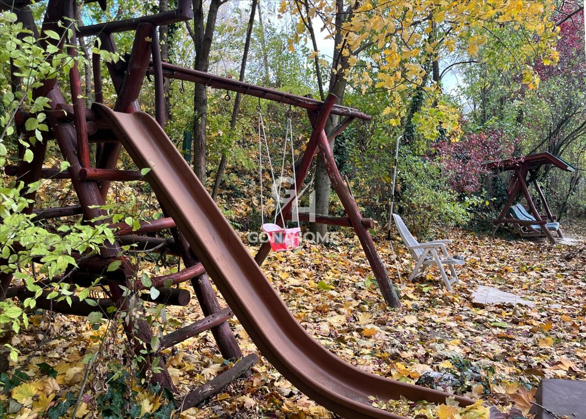 A kert rendezett, 5 mandulafával, 1 cseresznyefával és 40 tujával. Található benne egy kis tó, szalonnasütő és sziklagrill, valamint rönkfából készült gyerekjátszótér. Emellett egy 30 m²-es faház is rendelkezésre áll, amely raktárként használható, előterében pedig felfújható jakuzzi kapott helyet.