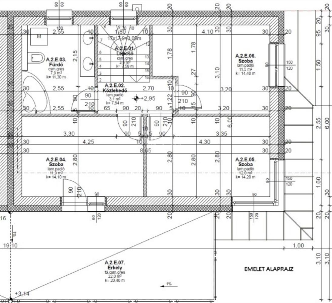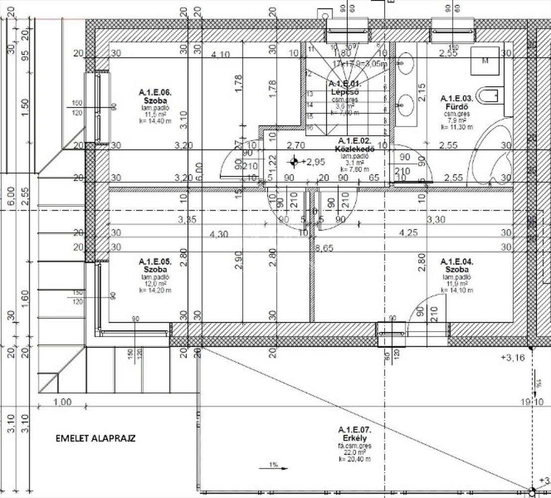 Emelet (50m2): 3 szoba, fürdő+wc, erkély (22m2)