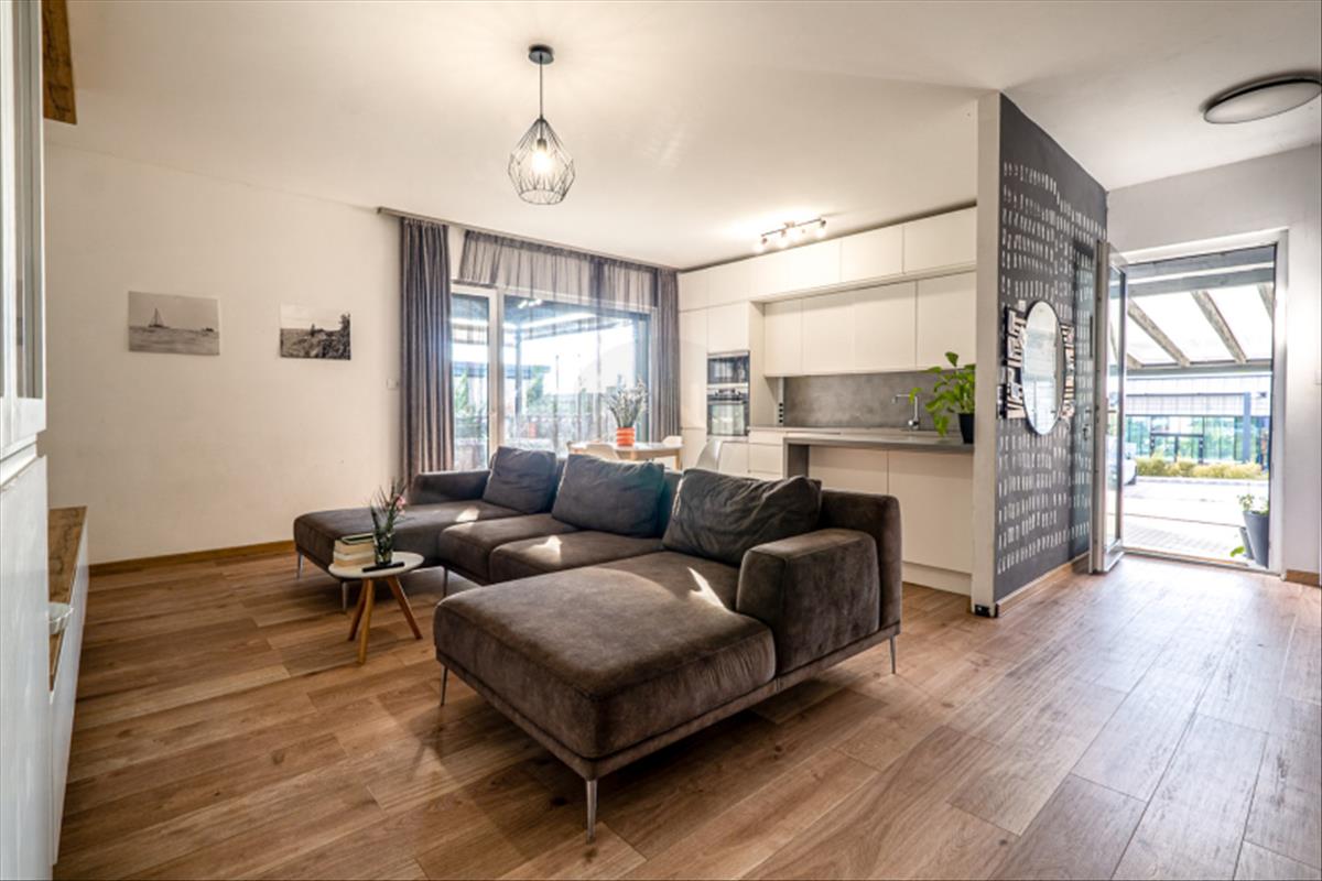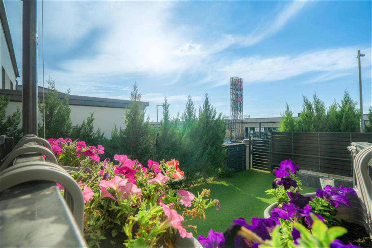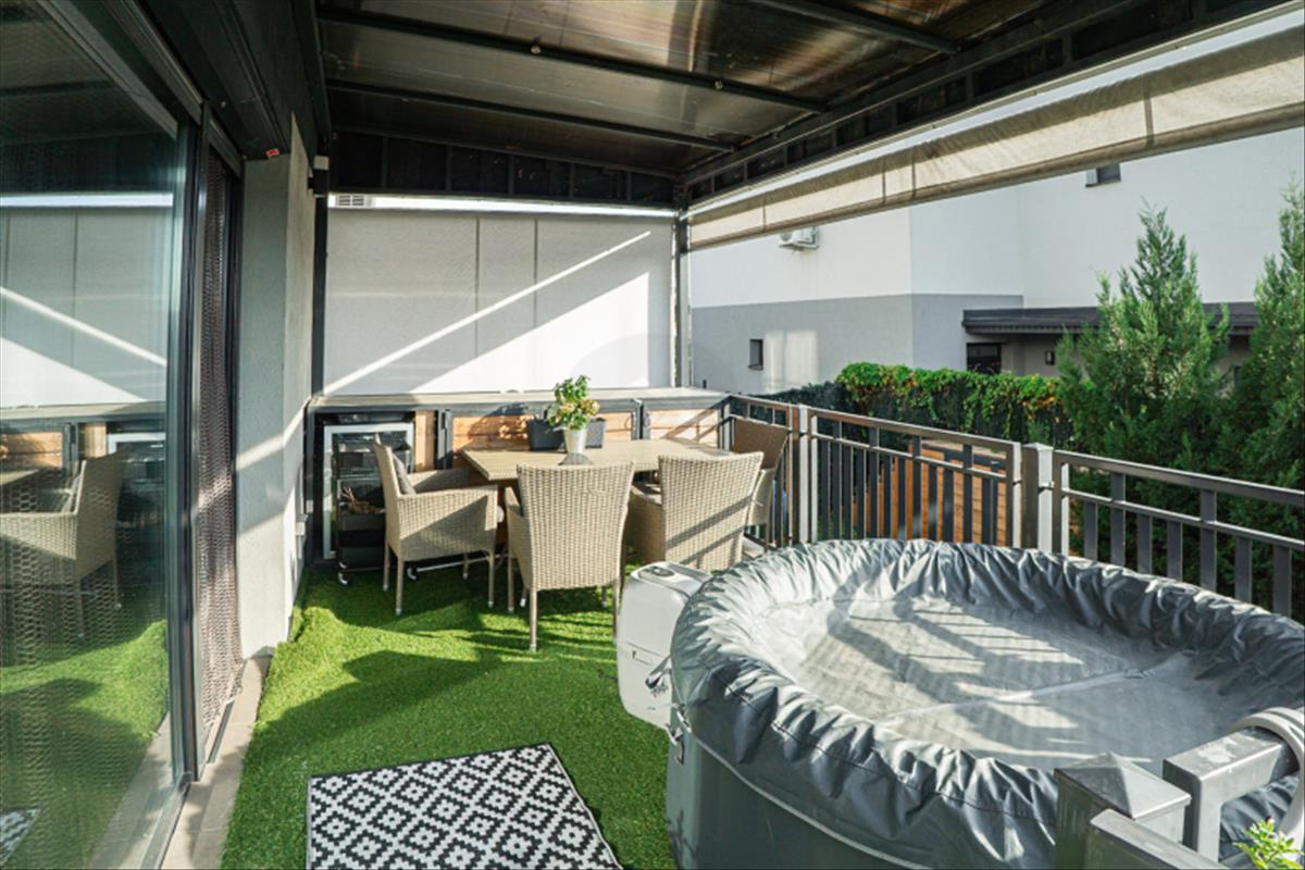 A lakáshoz tartozó kert igényesen kialakított, minőségi holland pázsittal, valamint egy jó méretű, körbekerített terasz is rendelkezésre áll, amely tökéletes helyszíne lehet családi vagy baráti összejöveteleknek.