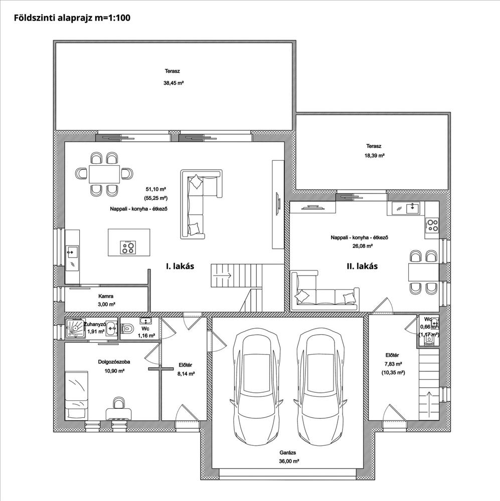 A hasznos alapterület 157 m², ehhez tartozik 36 m² garázs, 38 m2 terasz és 18 m2 erkély.