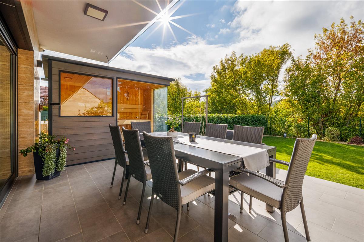 A kert tökéletességéről robotfűnyíró és öntözőrendszer gondoskodik, a stílusos kerti garnitúrák a pihenést és a meghitt hangulatot erősítik. a gondosan megtervezett terasz közvetlen kapcsolatot teremt a nappalival és a wellnessrészleggel, így a kültér a mindennapi élet természetes kiterjesztésévé válik.