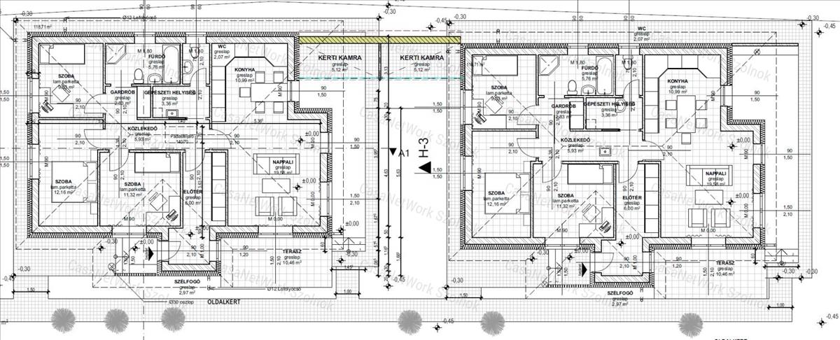 Hasznos alapterületük külön-külön 92 nm, a hozzájuk tartozó kertrész 400-400 nm.