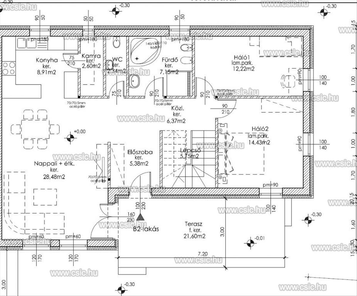A földszinten tágas, 37 m²-es nappali biztosít kényelmes közösségi teret a család számára, közvetlen teraszkapcsolattal. a 20 m²-es terasz ideális helyszíne lehet családi reggeliknek, baráti grillezéseknek vagy a gyerekek felügyeletének játék közben.