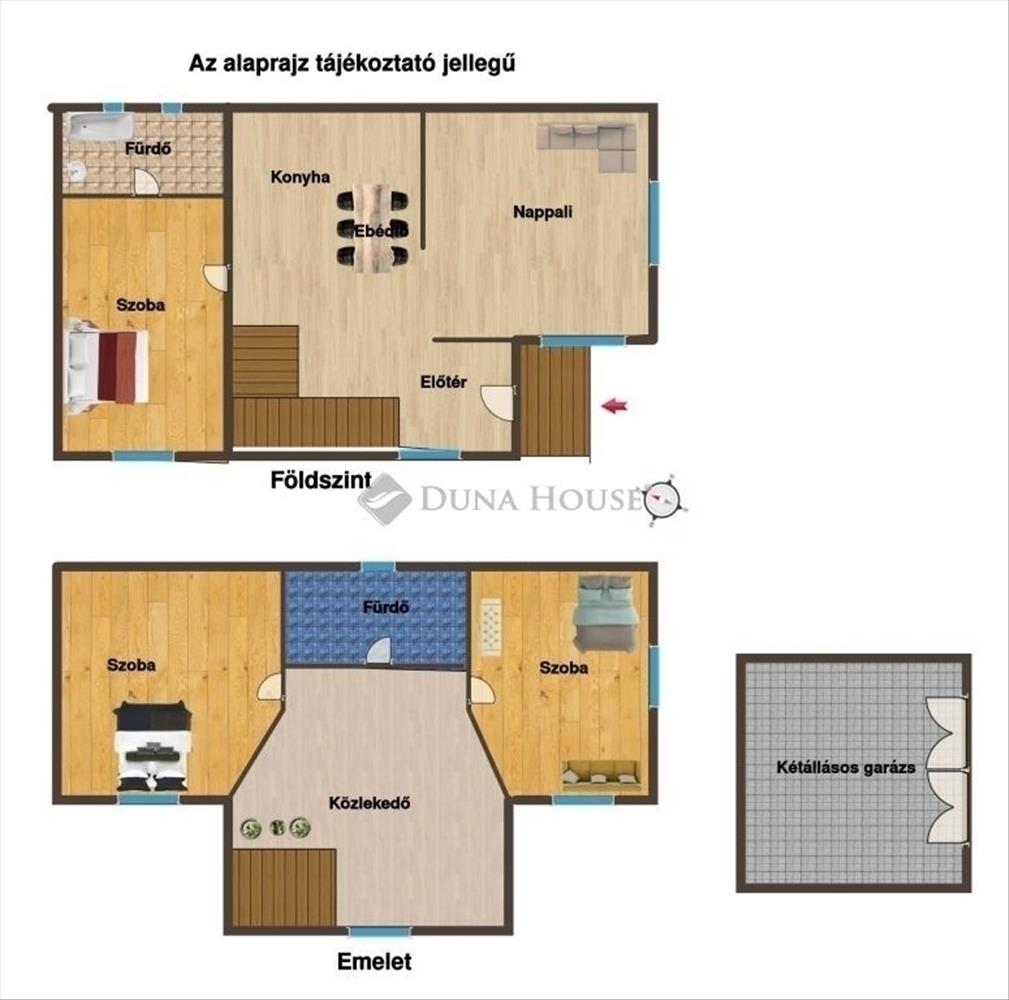 Emelet: Jól kihasználható, tágas közlekedő, két nagy méretű, külön bejáratú hálószoba, és egy közös fürdőszoba.