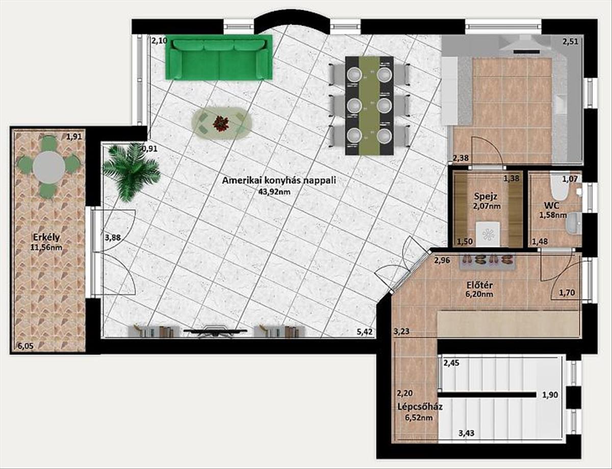 A földszint 61nm , ahol található az amerikai konyhás nappali, a spejz, a wc és a közlekedő. a hátsókert felé nyílik egy 12nm -es terasz, ahonnan a kertkapcsolatunk is adott.