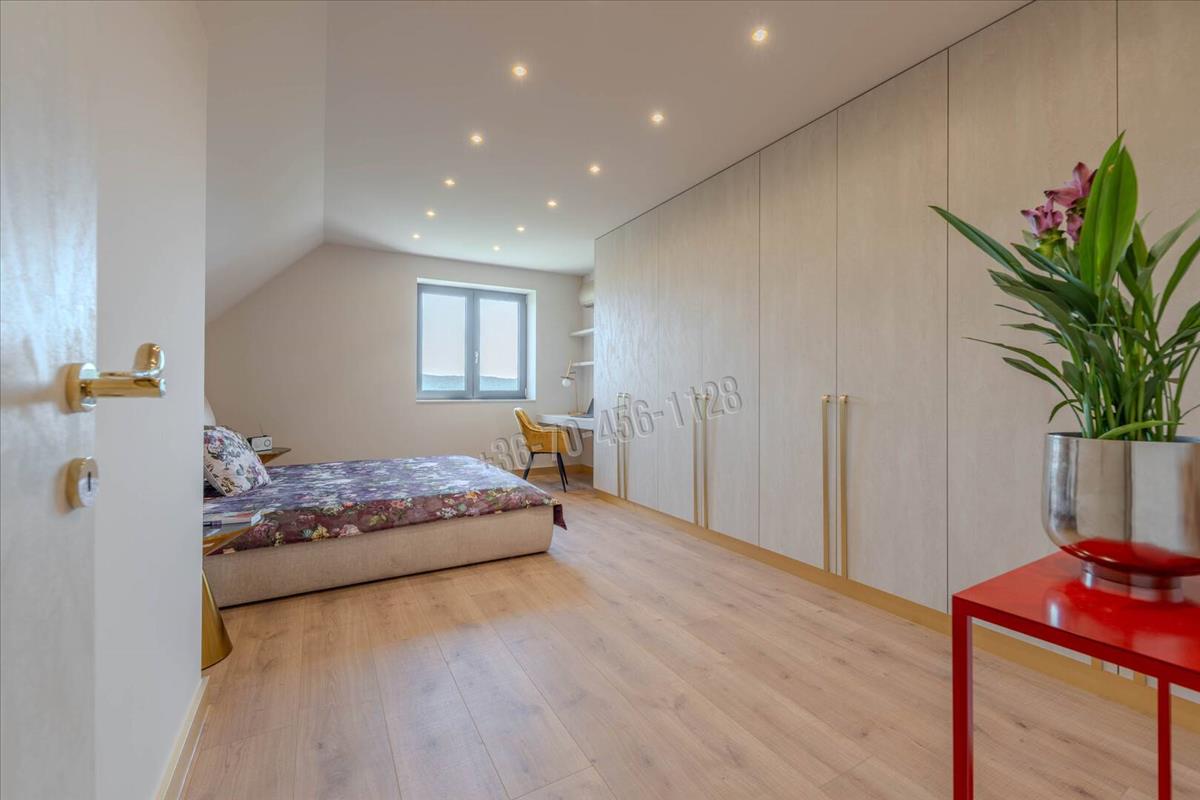A 630 nm-es telken lévő épületet totálisan újraépítették, a magas minőség, a funkcionalitás, a kényelem és a szépség jegyében. Kezdjük kintről, az ingatlanhoz két külső parkoló is tartozik, a kényelmes lejtésű lejáró fűtött garázsba vezet, ahol két középkategóriás autó elfér. a garázsból a lakótérbe lépve először ismerkedjünk meg a nappali szinttel. a névadó helyiség az étkezővel együtt 33 nm alapterületű, látványos belsőépítészeti megoldásokkal, esztétikai és komfort szempontból is jól eltalált, természetesen full gépesített konyhával. Külön wc, illetve háztartási helyiség van még ezen a szinten. a nappaliból kilépve egy 100 m-es édenkert vár minket, selymes, ápolt gyeppel, jacuzzival, hideg-meleg vizes zuhannyal, kerti grillel és a kertből nézve is mellbevágó zöldpanorámával. Ha sikerült elszabadulni a látványtól, nézzük meg a szülői hálószintet: hatalmas hálószoba, egyedi építésű, lebegő hatást keltő ággyal, kádas és zuhanyzós, gyönyörű fürdővel, terasszal, ahonnan még egy fokkal szebb a kilátás. a tetőtérben két nagyobb és egy kisebb szoba található, valamint egy duplamosdós, kádas fürdő és infraszauna.