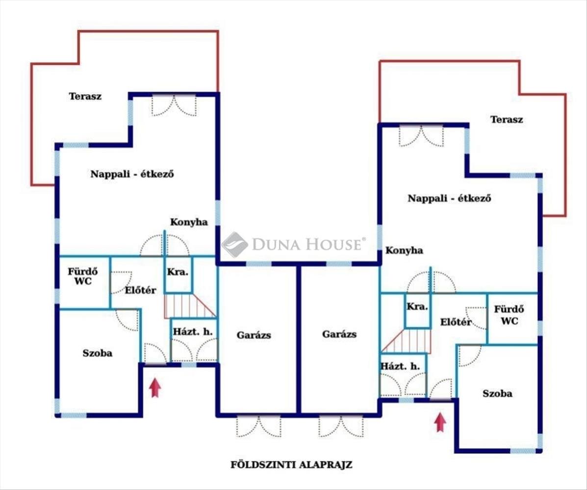 Az ikerház: nappali + 4 szoba + teraszok. 1 Autó számára garázs, 2. Autó számára kültéri beálló hely.