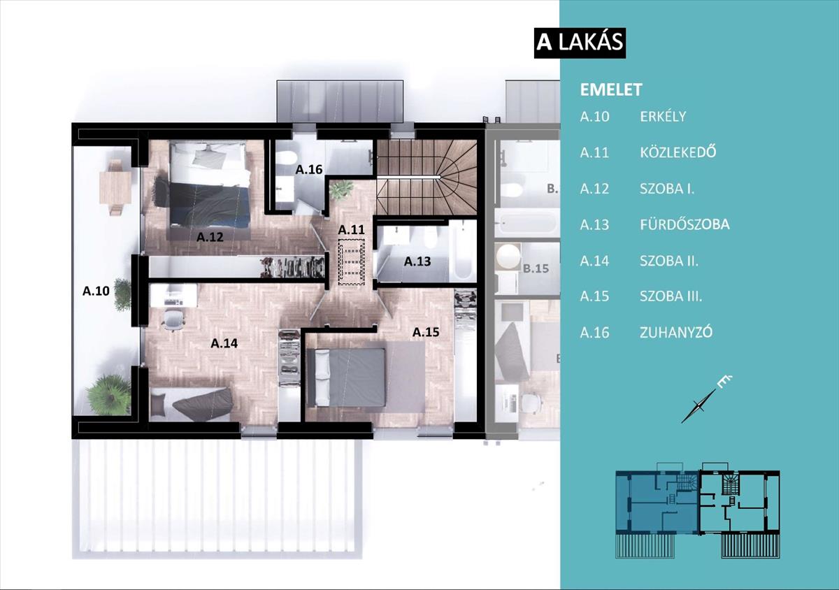 A/2: 108nm +37nm terasz, Nappali + 4 hálószoba, 280nm -es kert, 2 felszíni beálló- 199, 9Mft.