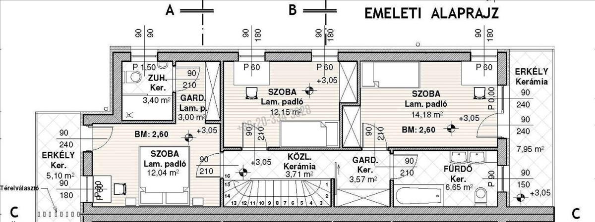 -emeleten 3 hálószoba, fürdőszoba, közlekedő,