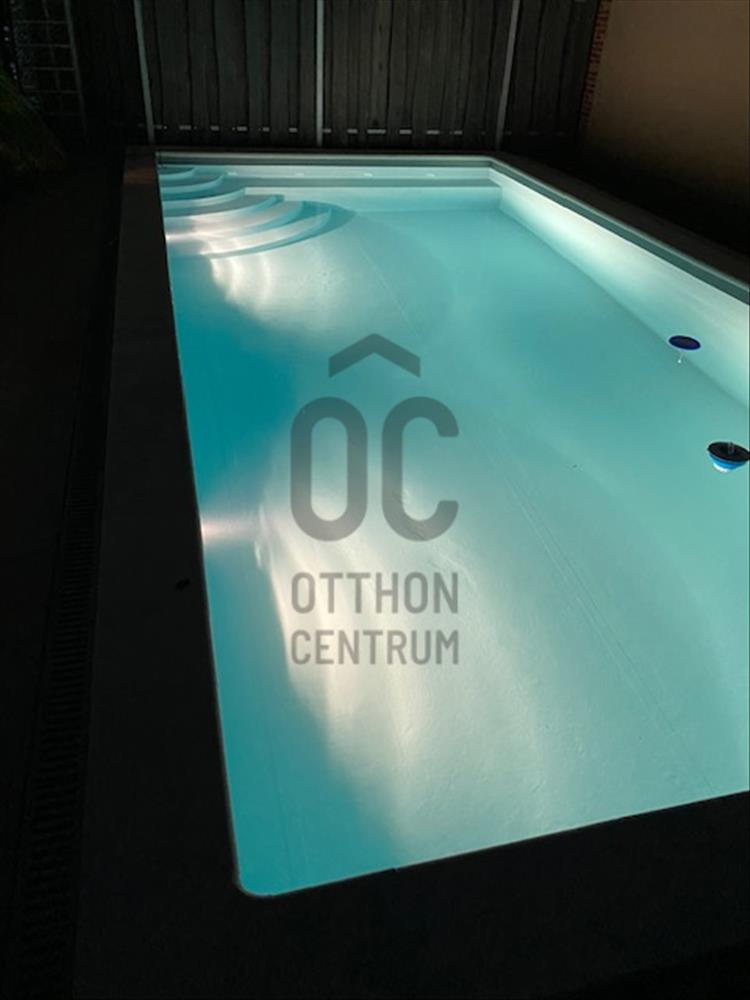 A hátsó teraszon egy 8x4 méteres, gazdaságosan fűthető, nyakzuhannyal ellátott medence található, amely tavasztól őszig használható. Mellette egy gyönyörű, fával burkolt napozóterasz és egy szolár zuhany biztosítja a kényelmet.