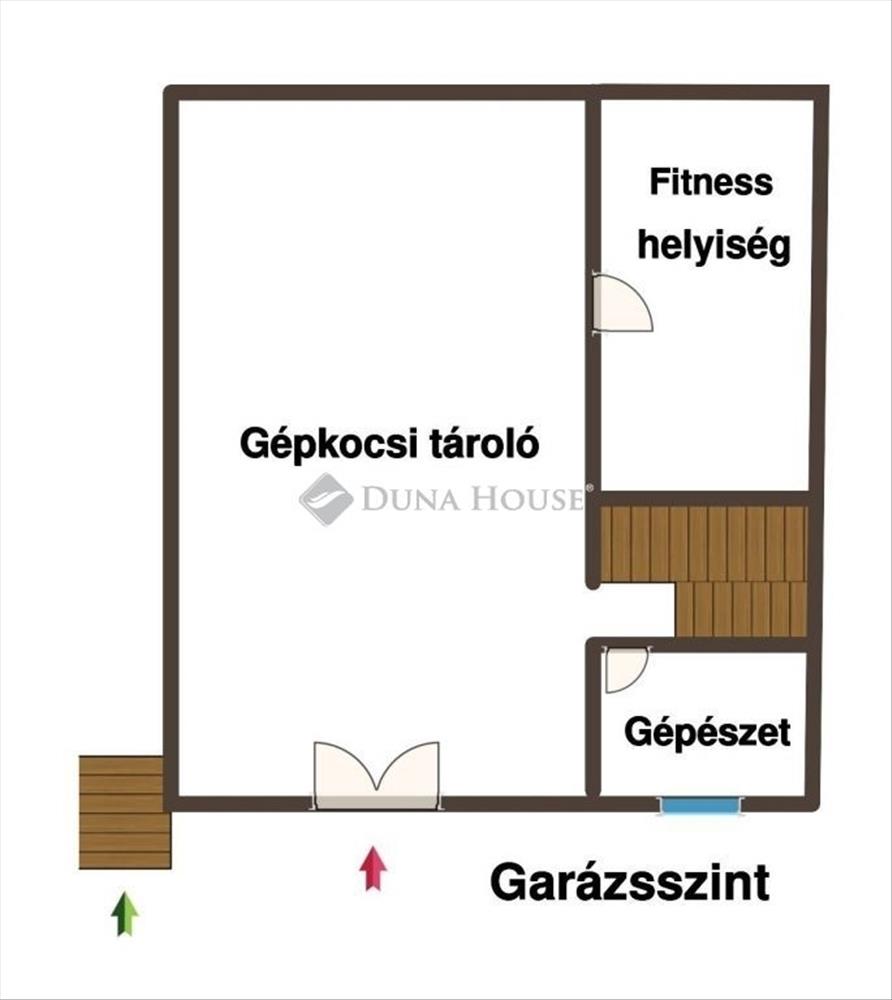 - Az utcaszintről megközelíthető a dupla garázs, mellette a wellness helyiség és a gépészet. Innen közvetlen lépcsőház vezet a nappali szintjére.