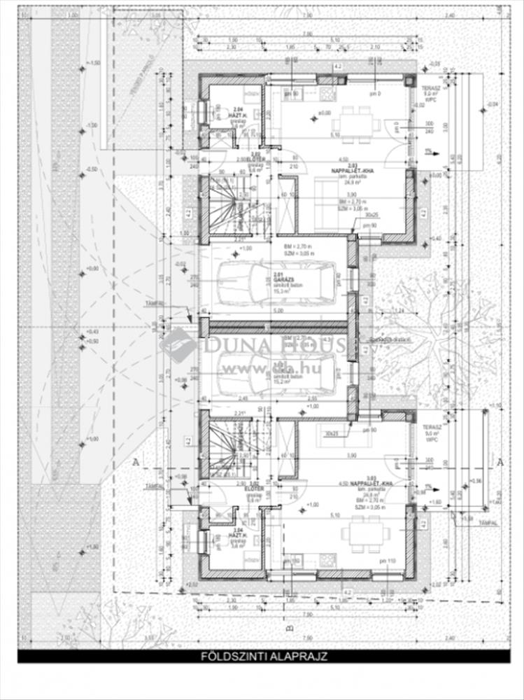 A földszinten található a nappali -étkező- konyha kombinációban a legnagyobb helyiség, melyből a teraszra és a földszinti kiszolgáló helyiségekbe is eljuthatunk. a földszinten kapott helyet egy gépészeti rendszert is rejtő helyiség, de az előtérből beléphetünk a garázsba is. a garázs magában rejti a választás lehetőségét, igény szerint megtartható garázsnak, leválaszthat belőle egy különálló konyha vagy további egy szoba.