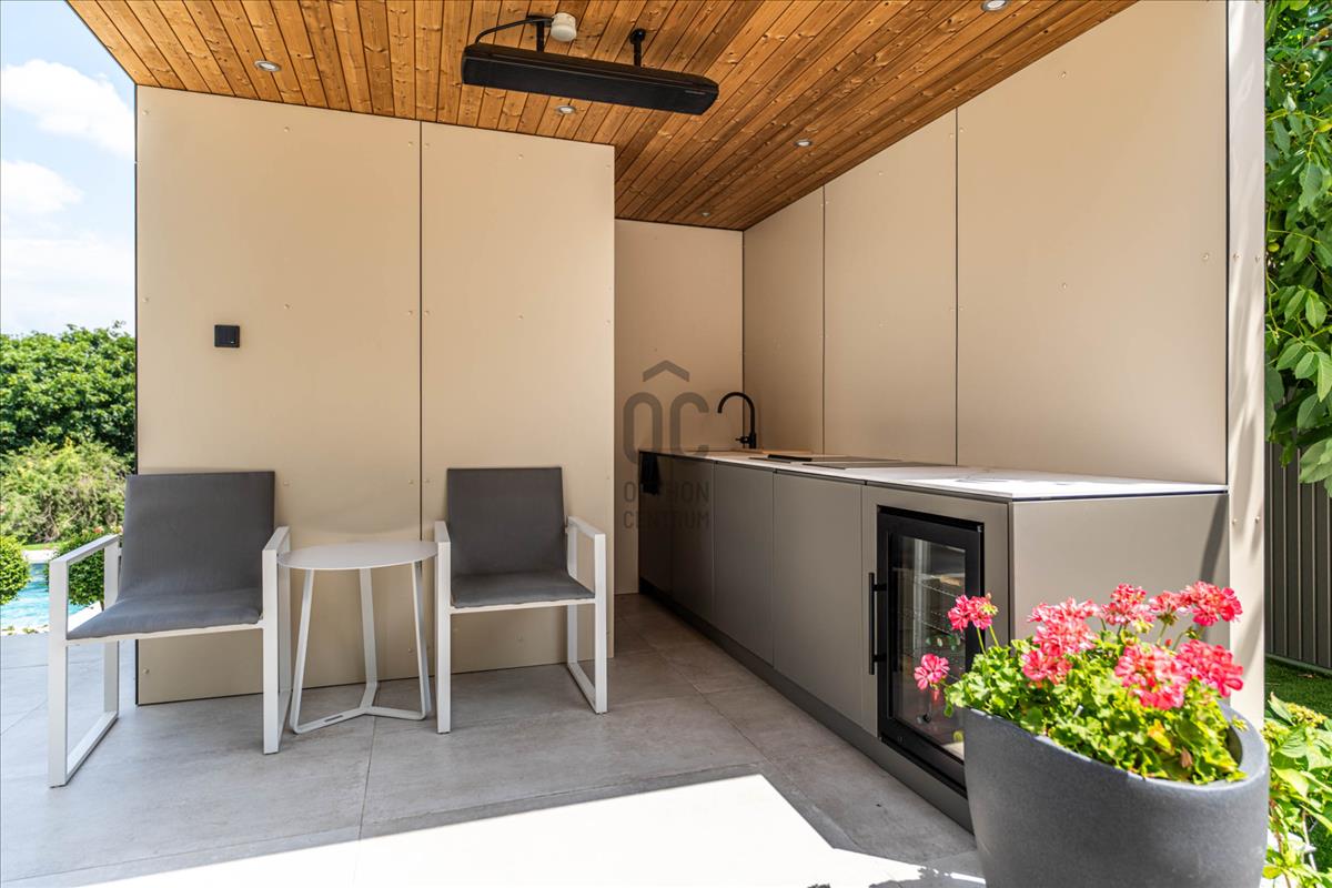 A medence jól használható, fedett illetve szintén panorámás és, ha egy hideg italra vágyunk a nyári hőségben (vagy nap végén egy pohár proseccora) csak néhány lépést kell tennünk a kinti beépített italhűtőig.