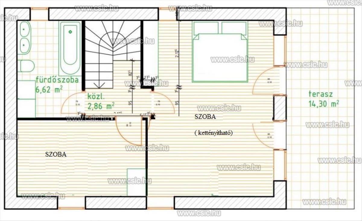 •2 hálószoba (ebből az egyik nagy méretű, könnyedén két külön szobára átalakítható) → így akár nappali + 4 hálós elrendezés is elérhető, az alaprajza a képek között megtalálható