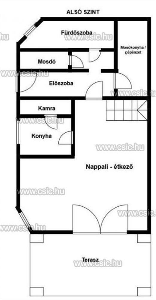 A ház belső háromszintes. Az alsó szinten található egy 30 m²-es nappali-étkező, melyhez egy csodás, panorámás terasz kapcsolódik. Innen a saját kertünkben is gyönyörködhetünk, vagy akár az ott játszó gyerekeket is felügyelhetjük. Ezen a szinten helyet kapott egy szeparált konyha, fürdőszoba, külön mosdó, valamint egy tágas mosókonyha, ahol bőven van hely a teregetéshez is.