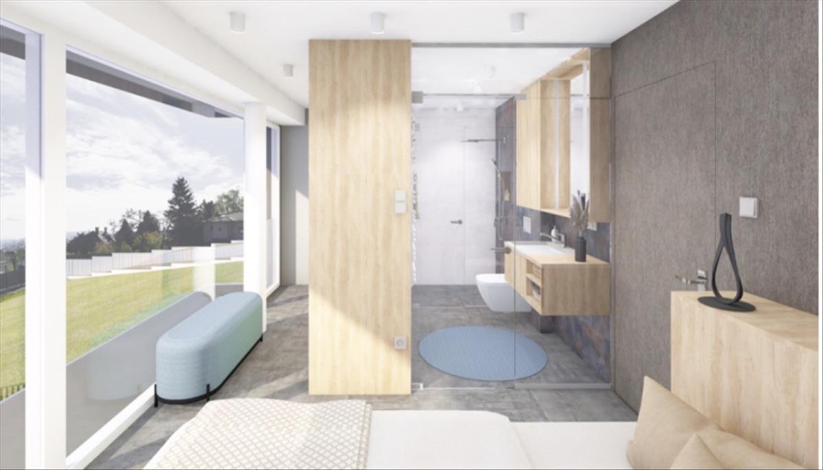 A nappali és a szülői háló hatalmas üvegfelületekkel nyílik a kert és az elvehetetlen panoráma felé. a tágas nappali-étkező-konyha tere dupla toló ajtóval nyitható össze a terasszal és a kerttel. a földszinten dolgozó helység van kialakítva. Az emeleten 20 m2-es szülői háló önálló fürdővel rendelkezik, a két gyerekszobához szintén külön fürdőszoba tartozik.